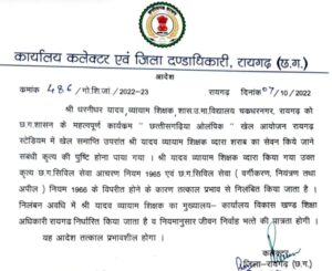 जारी आदेश के अनुसार निलंबन अवधि में यादव व्यायाम शिक्षक का मुख्यालय- कार्यालय विकास खण्ड शिक्षा अधिकारी रायगढ निर्धारित किया गया है व नियमानुसार जीवन निर्वाह भत्ते की पात्रता होगी । यह आदेश तत्काल प्रभावशील होगा ।