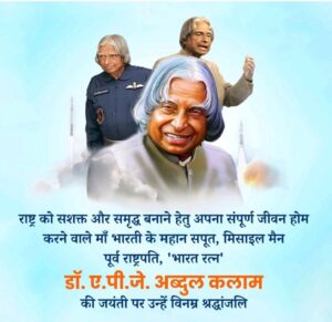 रायपुर -उच्च शिक्षा, कौशल विकास, तकनीकी शिक्षा एवं रोजगार, विज्ञान एवं प्रौद्योगिकी, खेल एवं युवा कल्याण मंत्री उमेश पटेल ने 15 अक्टूबर को पूर्व राष्ट्रपति, महान वैज्ञानिक भारत रत्न डॉ.ए.पी.जे.अब्दुल कलाम की जयंती पर उन्हें नमन किया है।