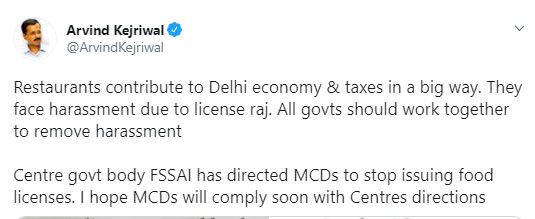 केजरीवाल ने रविवार को ट्वीट किया रेस्तरां दिल्ली की अर्थव्यवस्था और करों में बड़े पैमाने पर योगदान करते हैं। वे लाइसेंस राज की वजह से उत्पीड़न का सामना करते हैं। सभी सरकारों को उत्पीड़न को खत्म करने के लिए मिलकर काम करना चाहिए। केंद्र सरकार की संस्था एफएसएसएआई ने एमसीडी को खाद्य लाइसेंस जारी नहीं करने का निर्देश दिया है। मुझे उम्मीद है कि एमसीडी जल्द केंद्र के निर्देशों का पालन करेंगी।
