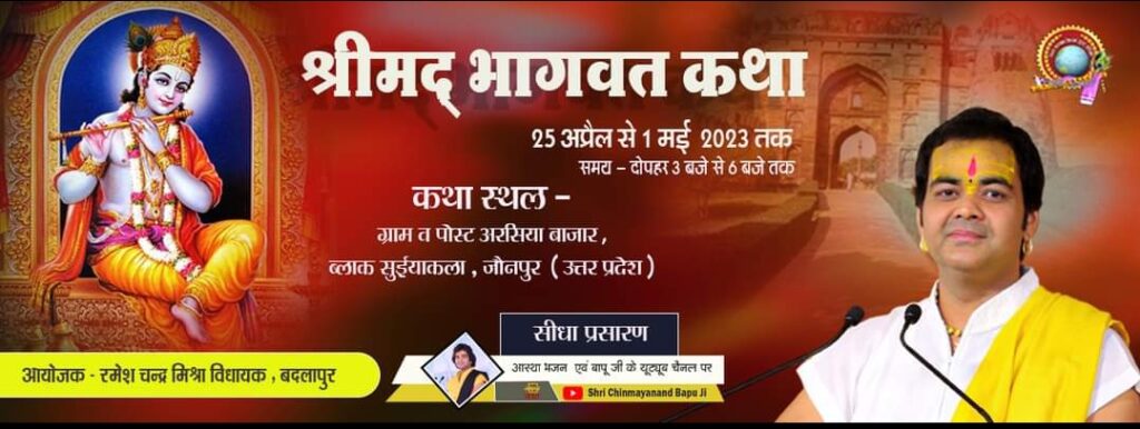 श्रीमदभागवत कथा कल्पतरू की तरह है जिसकी शरण मे बैठने पर हमारी सारी मनोकामनाएं पूर्ण करती है। इस दौरान खेल राज्यमंत्री स्वंत्रत मंत्री गिरीश चंद्र यादव, विधायक शाहंगज रमेश सिंह, भाजपा जिलाध्यक्ष पुष्पराज सिंह, महामंत्री सुशील मिश्र, डीसीएफ के चेयरमैन धनजंय सिंह, प्रमुख प्रतिनिधि डा उमेश चंद्र तिवारी, राजीव सिंह, प्रबुध दूबे, प्रधान मनोज यादव, अंकूर मिश्र प्रबंधक विनोद सिंह वत्स अन्य मौजूद रहे।