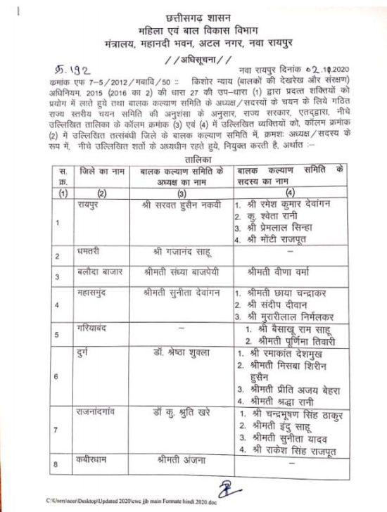 रायपुर। महिला एवं बाल विकास के तहत आज एक और अहम नियुक्ति हुई है। राज्य सरकार ने आज बालक कल्याण समिति के अध्यक्ष और सदस्यों की नियुक्ति कर दी है। राजधानी रायपुर सहित 26 जिलों के लिए ये नियुक्ति हुई है, जबकि 2 जिलों में अभी नियुक्ति वेटिंग में है। राज्य स्तरीय समिति की अनुशंसा के आधार पर ये नियुक्ति हुई है। रायपुर में सरवत हुसैन नकवी को बालक कल्याण समिति की अध्यक्ष बनाया गया है। वहीं रमेश कुमार देवांगन, श्वेता रानी, प्रेमलाल सिन्हा और मोंटी राजपूर को मेंबर बनाया गया है।