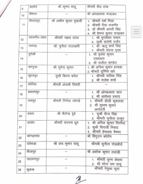 वहीं बिलासपुर में असीम कुमार मुखर्जी अध्यक्ष बनाये गये हैं, जबकि वर्षा मिश्रा, रीता राजगीर, आरती सिंह और हेमंत कुमार चंद्राकर सदस्य बनाये गये हैं।