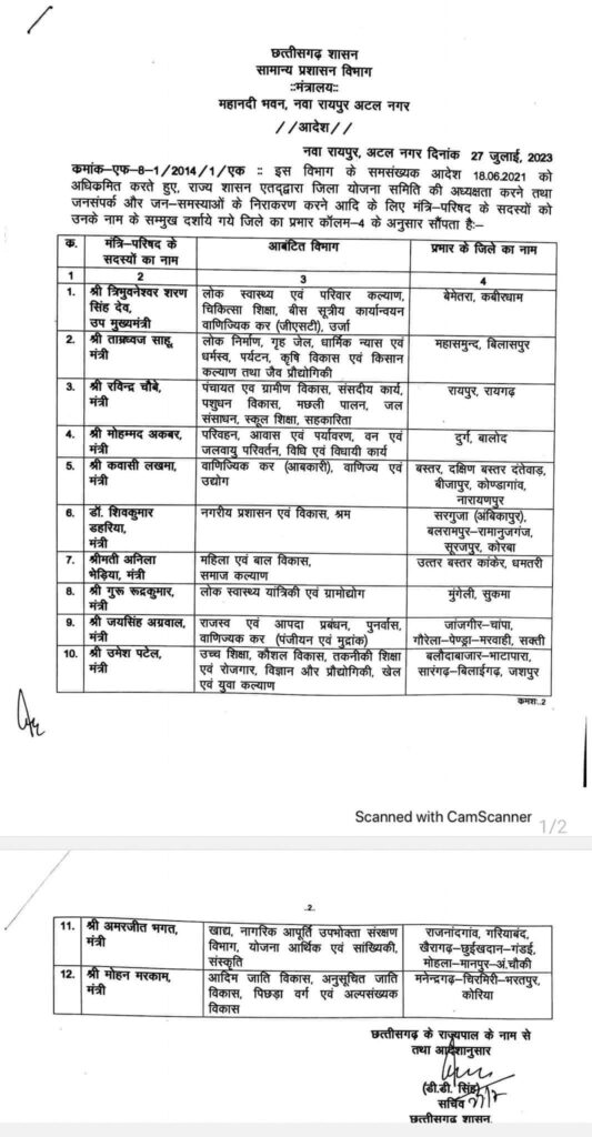 रायगढ़ जिले के प्रभारी मंत्री होंगे रविन्द्र चौबे…मंत्रियों के जिलों के प्रभार बदले…जानिए किस मंत्री को मिला कौन सा जिला मिला
