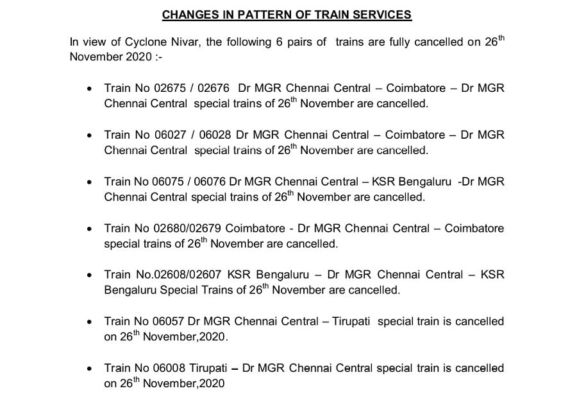 #CycloneNivar #bulletinSR Changes in the pattern of Train Services pic.twitter.com/jEsGjhWonv