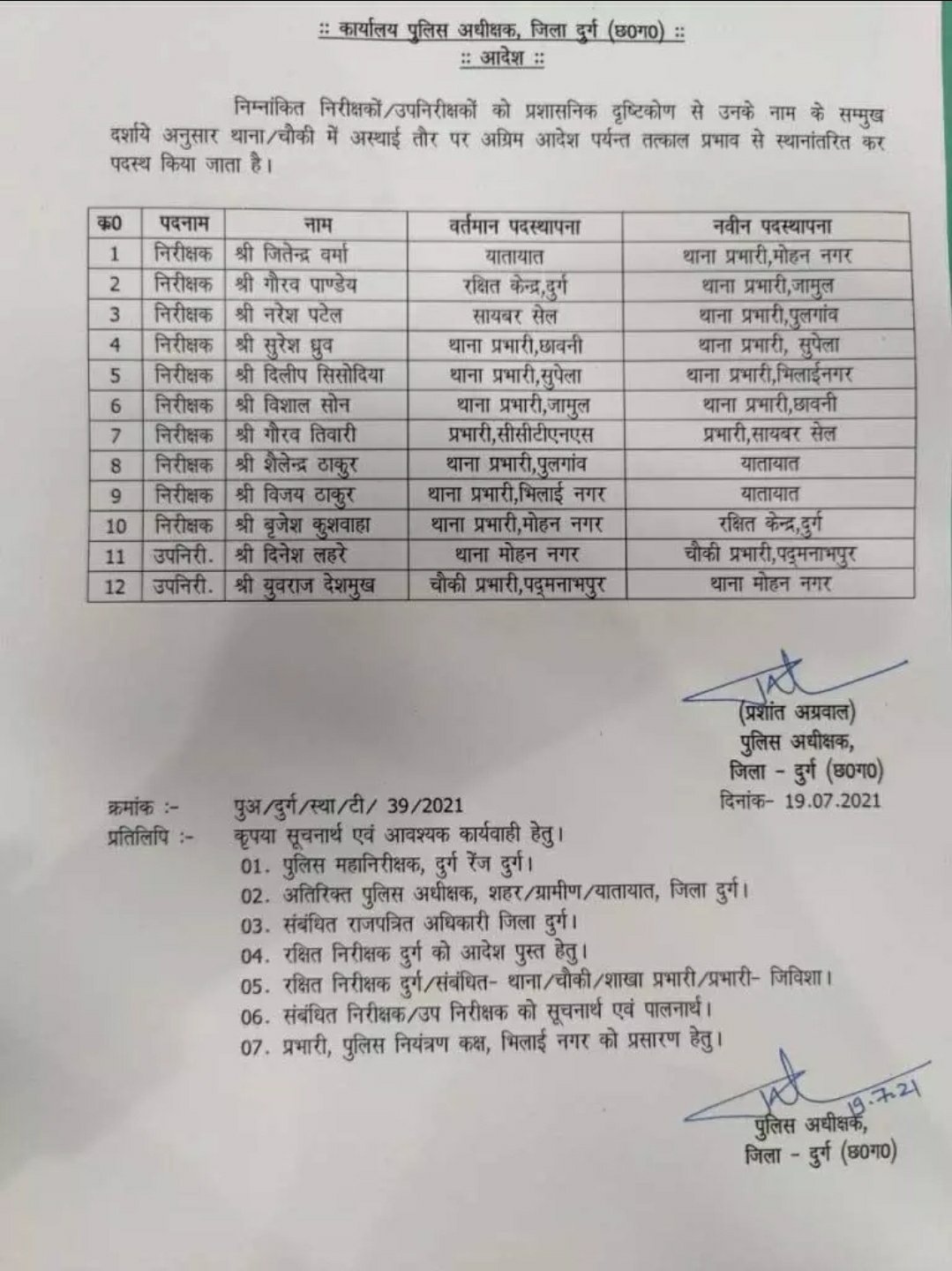 दुर्ग एसपी ने 10 थाना प्रभारियों और 02 एसआई का तबादला किया है. जारी सूची में वहीं यातायात निरीक्षक डी.पी रात्रे को पाटन का पुलिस अनुविभागीय अधिकारी (SDOP) बनाया गया है. पुलिस अधीक्षक (SP) प्रशांत अग्रवाल ने आदेश जारी किया है.