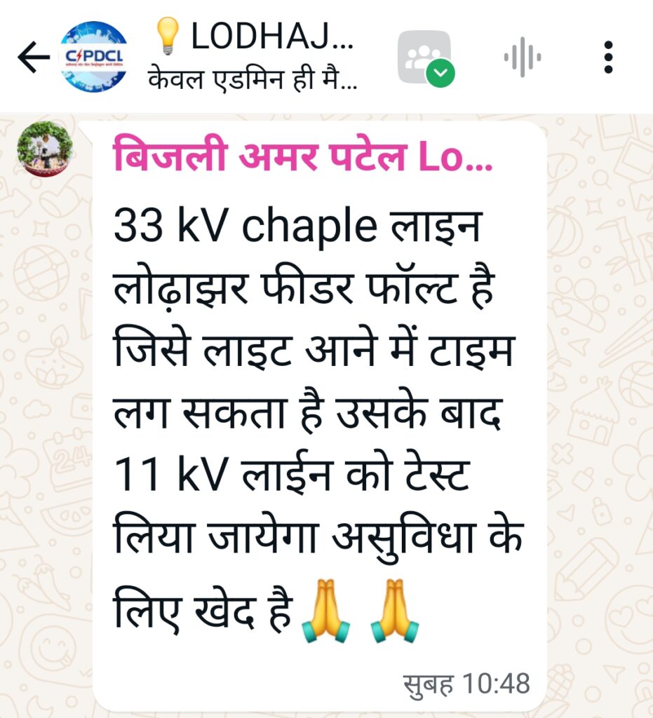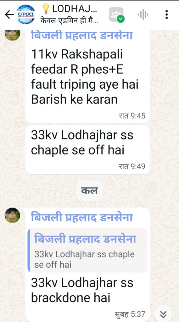 भारी वर्षा और लाइटिंग के कारण चपले से लोढा़झर सबस्टेशन को आने वाली 33केबी और 11केबी ब्रेक डाउन हो गया था जिसे सुचारु करने एई अशोक नायक,जेई राठिया,लाईन मेन की पूरा दल-बल लगा हुआ था 30के रात को 09:49से31को दोपहर 12:26तक कड़ी मेहनत उपरांत सुचारू किया जा सका।जिसके कारण रायगढ़ से ट्रांसफार्मर लाना सम्भव नहीं हो पाया।