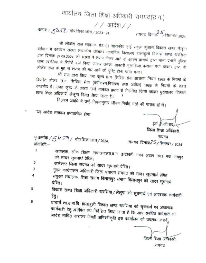 राज द्वारा किया गया कृत्य छ.ग सिविल सेवा आचरण नियम 1965 के नियमों के विपरित होकर छ.ग. सिविल सेवा (वर्गीकरण, नियंत्रण तथा अपील) 1966 के नियमों के तहत दण्डनीय है। उक्त कृत्य के कारण उन्हें तत्काल प्रभाव से निलंबित किया जाकर मुख्यालय विकास खण्ड शिक्षा अधिकारी लैलूंगा नियत किया जाता है।