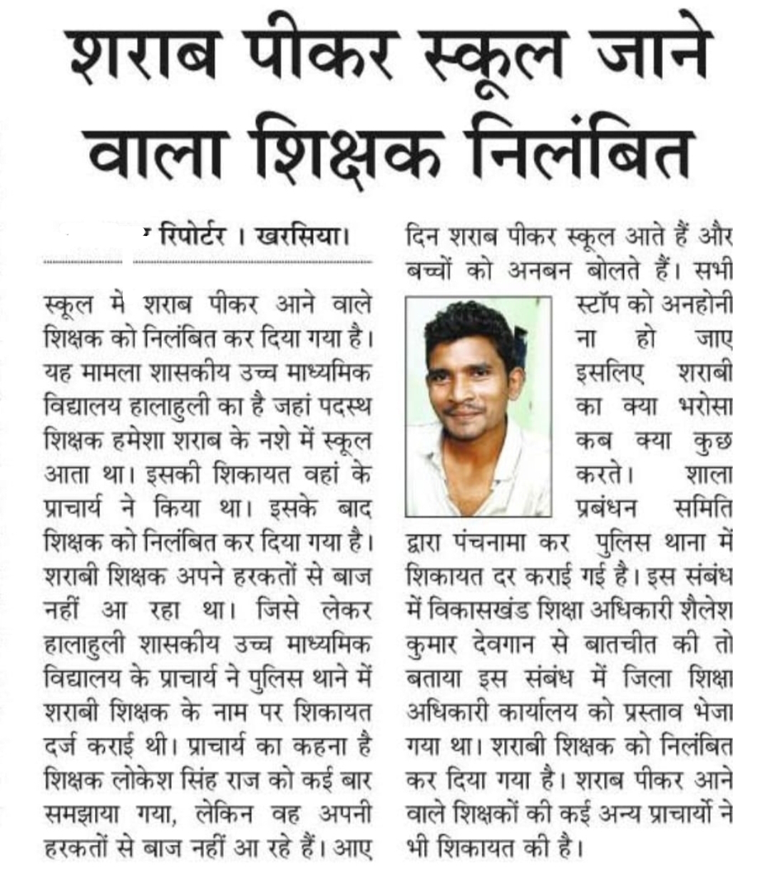 अखबार में सुर्खियों में रहे खबर जब क्षेत्र में जंगल में लगे दावानल की तरह फैलने लगा और आक्रोश भी पनपने लगा शिक्षकों बीच जमकर कानाफूसी होने लगा और खण्ड शिक्षा अधिकारी के कार्यालय तक पहुंचना लाज़मी है उनके द्वारा कहां गया कि “इस संबंध में विकासखंड शिक्षा अधिकारी शैलेश कुमार देवांगन से बातचीत की तो बताया इस संबंध में जिला शिक्षा अधिकारी कार्यालय को प्रस्ताव भेजा गया था।शराबी शिक्षक को निलंबित कर दिया गया है।” उपरोक्त बातों पर शिक्षकों द्वारा मिला जुला प्रतिक्रिया होते ही,अधिकारी के पास आंच पहुंचते ही खण्ड शिक्षा अधिकारी ने बताया कि मेरे द्वारा अवगत कराया गया कि कार्यालय जिला शिक्षा अधिकारी रायगढ़ (छ.ग.)आदेश क्रमांक/5458/ गोप शिका जांच / 2023-24रायगढ़ दिनाक 5 सितम्बर 2024लोकेश राज सहायक ग्रेड 03 शासकीय हाई स्कूल कुजारा विकास खण्ड लैलूंगा वर्तमान में कार्यरत सस्था शासकीय उच्चतर माध्यमिक विद्यालय हालाहुली विकास खण्ड खरसिया द्वारा दिनाक 24.09.2024 को सस्था में शराब पीकर आने के कारण प्राचार्य द्वारा थाना प्रभारी पुलिस थाना खरसिया में रिपोर्ट दर्ज किया जाकर उनका डाक्टरी मुलाहिजा कराया गया डाक्टर द्वारा लोकेश राज के मुंह से शराब की गध आने की पुष्टि होना पाया गया।