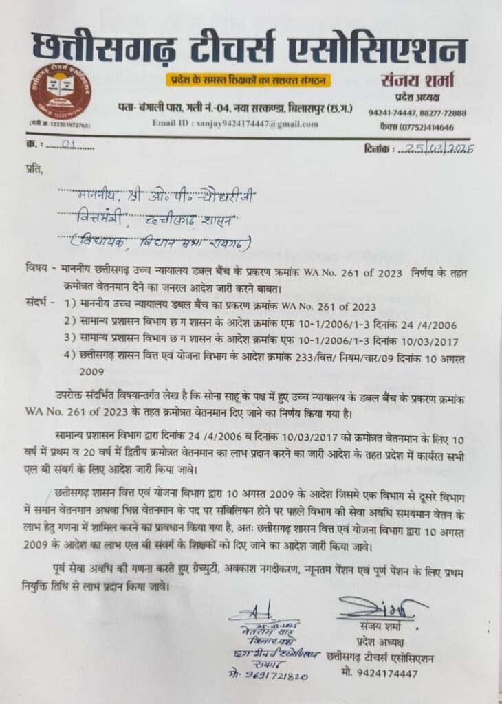 छत्तीसगढ़ टीचर्स एसोसिएशन जिला रायगढ़ ने अपने मांग में प्रमुखता से माननीय छत्तीसगढ़ उच्च न्यायालय डबल बैंच के प्रकरण क्रमांक WA No. 261 of 2023 निर्णय के आधार पर कामदेव टेकाम व अन्य शिक्षको को क्रमोन्नत वेतनमान हेतु अभ्यावेदन देने का निर्णय माननीय उच्च न्यायालय छत्तीसगढ़ ने दिया है, अतः कामदेव टेकाम व अन्य सहित सोना साहू के साथ प्रभावित सभी को क्रमोन्नत वेतनमान देने का जनरल ऑर्डर शासन जारी कराने की बात कही।