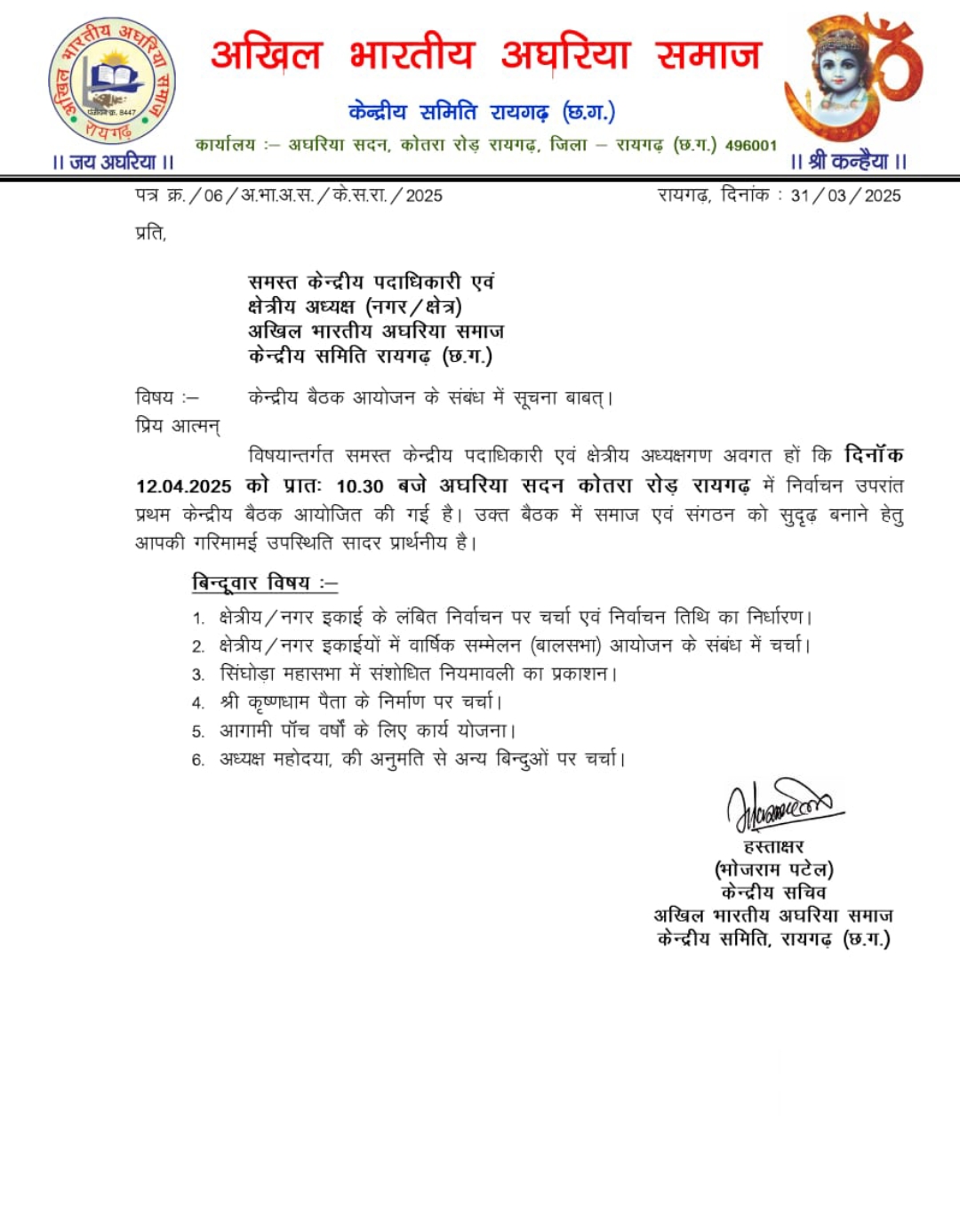 रायगढ़: अखिल भारतीय अघरिया समाज की केंद्रीय कार्यकारिणी समिति की प्रथम बैठक दिनांक 12 अप्रैल 2025 को प्रातः 10:30 बजे अघरिया सदन, कोतरा रोड, रायगढ़ में आयोजित की जा रही है। इस महत्वपूर्ण बैठक में केंद्रीय कार्यकारिणी के सभी सदस्य एवं समस्त क्षेत्रीय अध्यक्षों को ससम्मान आमंत्रित किया गया है।