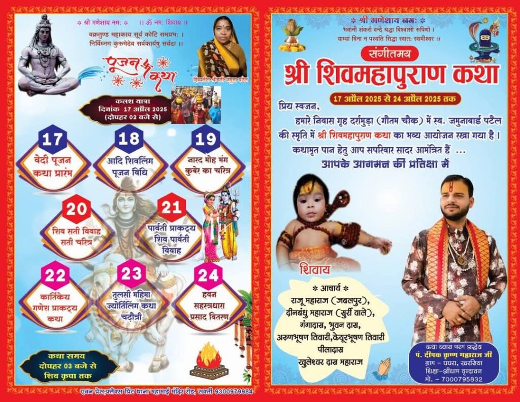 यह आयोजन 24 अप्रैल 2025 तक निरंतर चलेगा। पटेल परिवार की ओर से सभी श्रद्धालुओं को सपरिवार आमंत्रित किया गया है, ताकि वे इस अमृतमयी शिवकथा का लाभ लेकर अपने जीवन को अध्यात्म, सेवा और प्रेम से आलोकित कर सकें।