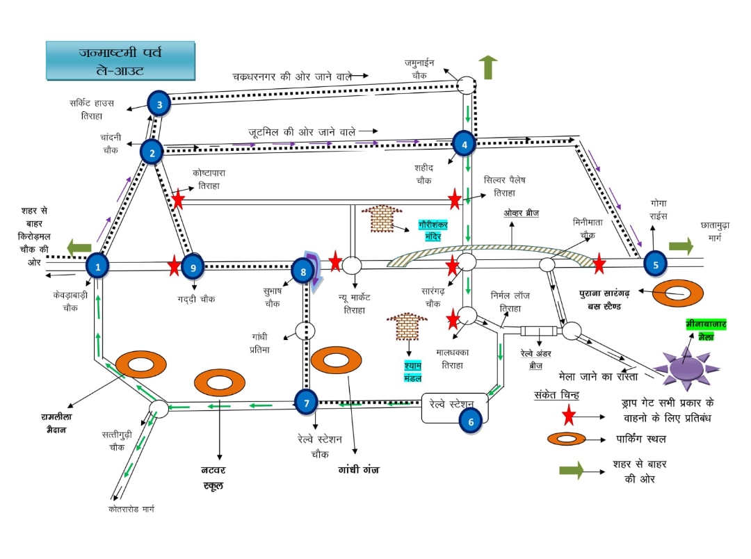 - रेलवे स्टेशन (प्वाइंट 06) से चक्रधरनगर की ओर जाने वाला यातायात – प्वाइंट 08 सुभाष चौक होते हुए प्वाइंट 09 गद्दी चौक से डायवर्ट होकर बांदनी चौक या सर्किट हाउस के रास्ते चक्रधरनगर जा सकेगा।
