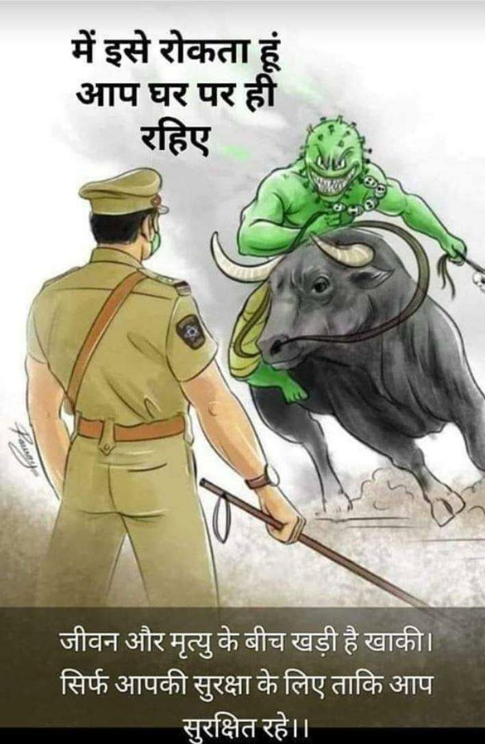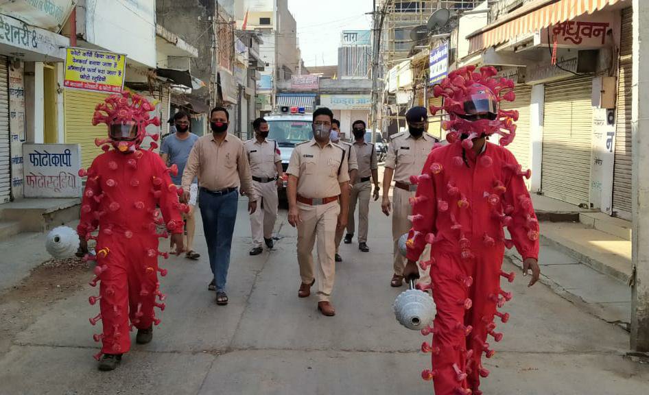 कोरोना वायरस का वेश धरे हुए पुलिस के दो जवानों ने आज शहर में घूम-घूम कर लॉक डाउन का पालन नही करने वाले, लापरवाही पूर्वक बिना कारण घर से बाहर घूम रहे लोगों को संदेश दिया कि कोरोना आपसे व आपके घर से तब तक दूर रहेगा जब तक आप उसे खुद लेने घर से बाहर नही निकलेंगे। मतलब घर के बाहर निकलने से कोरोना वायरस से संक्रमित होने की संभावनाएं हर जगह मौजूद हो सकती है।