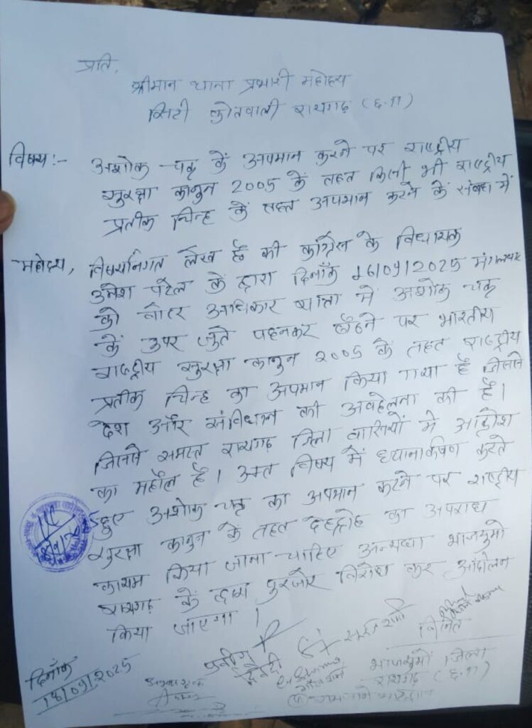 16 рд╕рд┐рддрдВрдмрд░ рдХреЛ рд░реИрд▓реА рдХреЗ рджреМрд░рд╛рди рдПрдХ рдлреЛрдЯреЛ рд╕реЛрд╢рд▓ рдореАрдбрд┐рдпрд╛ рдкрд░ рд╡рд╛рдпрд░рд▓ рд╣реБрдИред рднрд╛рдЬрдкрд╛ рдиреЗ рдЖрд░реЛрдк рд▓рдЧрд╛рдпрд╛ рдХрд┐ рдЦрд░рд╕рд┐рдпрд╛ рд╡рд┐рдзрд╛рдпрдХ рдиреЗ рдЕрд╢реЛрдХ рдЪрдХреНрд░ рдкрд░ рдкреИрд░ рд░рдЦрдХрд░ рдЙрд╕рдХрд╛ рдЕрдкрдорд╛рди рдХрд┐рдпрд╛ рд╣реИред рд╢рд╛рдо рд╣реЛрддреЗ-рд╣реЛрддреЗ рднрд╛рдЬрдпреБрдореЛ рдХрд╛рд░реНрдпрдХрд░реНрддрд╛ рдерд╛рдиреЗ рдкрд╣реБрдБрдЪ рдЧрдП рдФрд░ FIR рдХреА рдорд╛рдВрдЧ рдХреАред