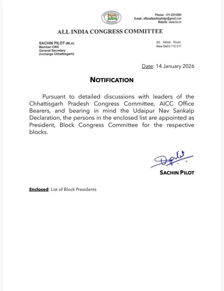 कांग्रेस पार्टी नेतृत्व द्वारा जिला और ब्लॉक स्तर पर संगठन को मजबूत करने की चल रही कवायद के तहत यह निर्णय लिया गया है। खरसिया विकासखंड में शहर और ग्रामीण, दोनों क्षेत्रों में कांग्रेस की गतिविधियों को संतुलित और प्रभावी बनाने के उद्देश्य से यह जिम्मेदारियाँ तय की गई हैं। इससे स्पष्ट है कि संगठन अब रणनीतिक ढंग से स्थानीय नेतृत्व को आगे बढ़ाने की दिशा में अग्रसर है।