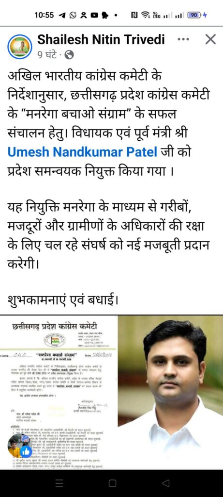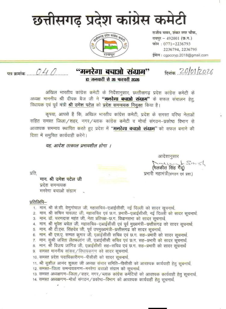 रायपुर।अखिल भारतीय कांग्रेस कमेटी के दिशा-निर्देशानुसार छत्तीसगढ़ प्रदेश कांग्रेस कमेटी द्वारा संचालित “मनरेगा बचाओ संग्राम” अभियान के प्रदेश समन्वयक के रूप में विधायक एवं पूर्व मंत्री उमेश नंदकुमार पटेल की नियुक्ति को संगठनात्मक दृष्टि से महत्वपूर्ण कदम माना जा रहा है।