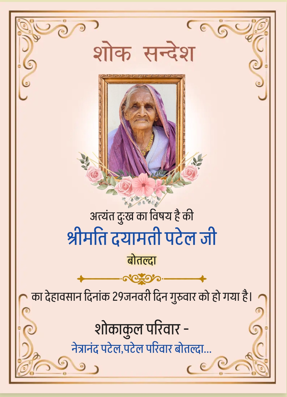 शोक संदेश में बालक राम पटेल ने ईश्वर से प्रार्थना की कि महाकाल प्रभु दिवंगत आत्मा को अपने चरणों में स्थान देकर मोक्ष प्रदान करें तथा पूज्य चाची जी का सूक्ष्म संरक्षण कौशिल परिवार पर सदैव बना रहे।