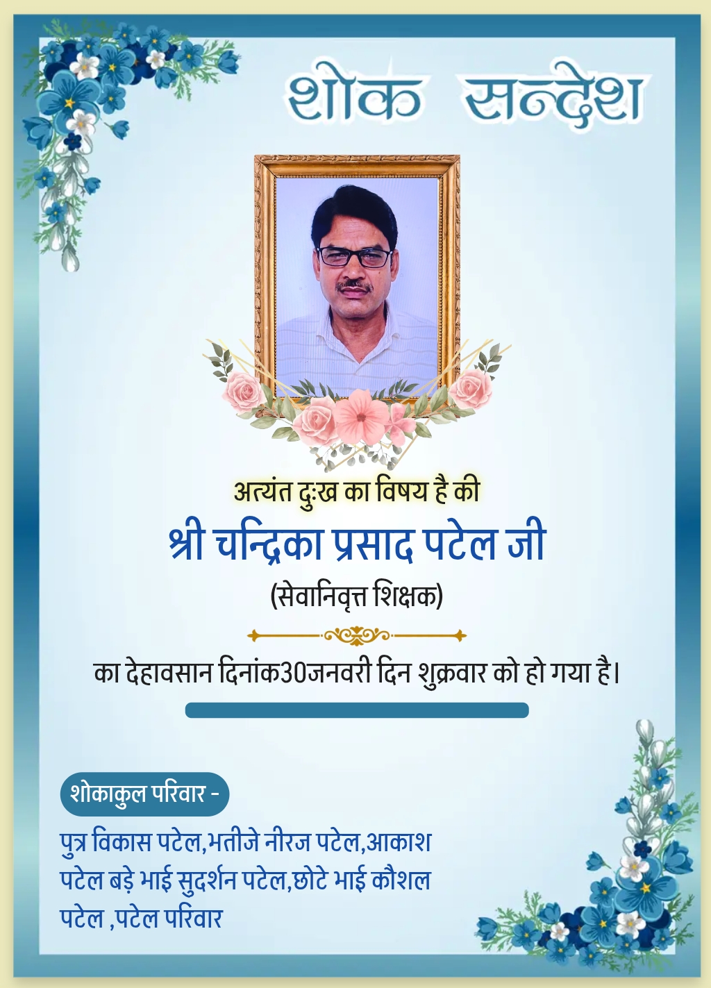 खरसिया। खरसिया निवासी सेवानिवृत्त शिक्षक चंद्रिका प्रसाद पटेल (पिता—अनुजराम पटेल, बिलाईगढ़ वाले) का शुक्रवार, 30 जनवरी 2026 की शाम शिवलोक गमन हो गया।
