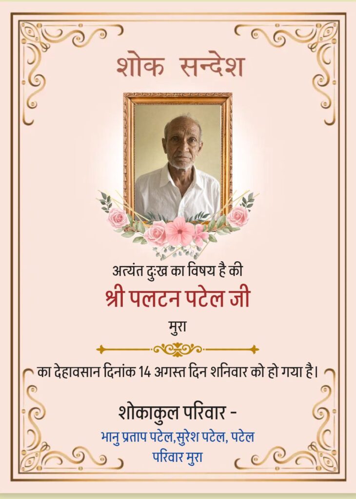 खरसिया। ग्राम मुरा निवासी भानुप्रताप पटेल एवं सुरेश पटेल को पितृ शोक हुआ है। उनके पिता पलटन पटेल के निधन से परिवार सहित परिजनों एवं क्षेत्र में शोक का माहौल व्याप्त है।