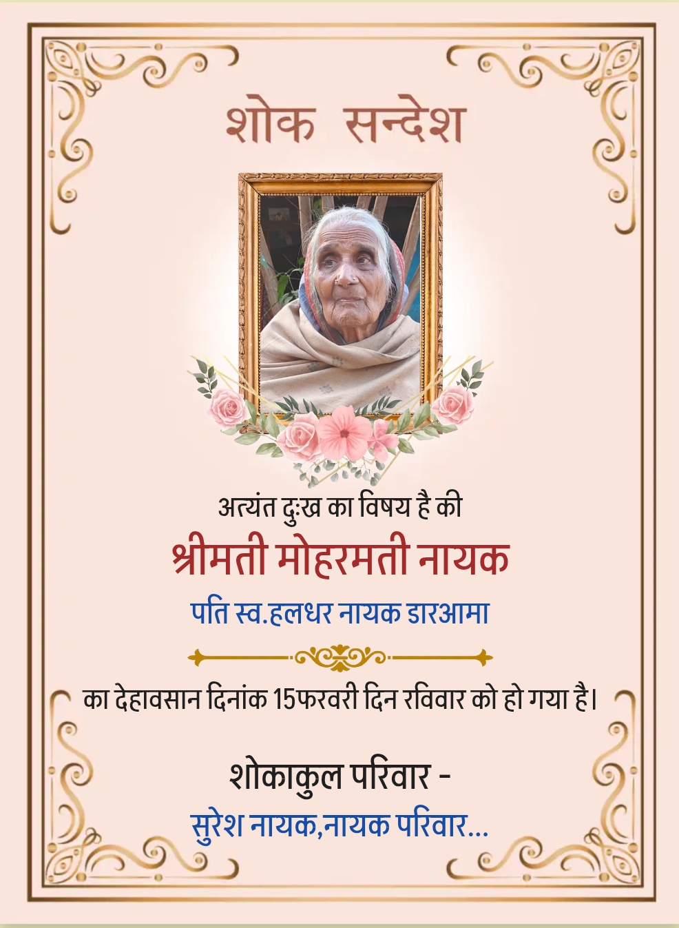खरसिया। ग्राम डारआमा निवासी सुरेश नायक (पिता स्व. हलधर नायक) के परिवार में मातृ शोक व्याप्त है। उनकी माता श्रीमती मोहरमति नायक का महाशिवरात्रि के दिन शिव लोक गमन हो गया। वे अपने पीछे पुत्र-पुत्री, बहू एवं नाती-पोतों से भरा-पूरा परिवार रोते बिलखते छोड़ गई।