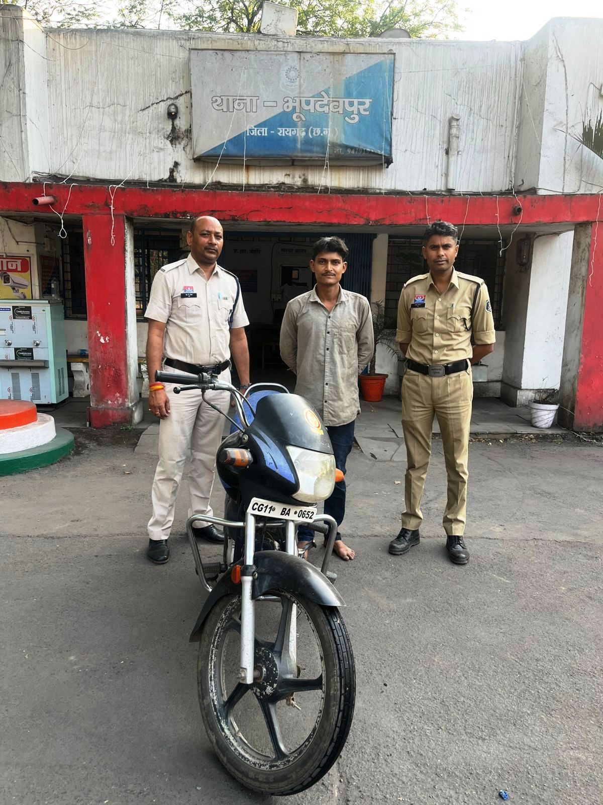 भूपदेवपुर पुलिस से आरोपी सुधांशु देहरी पिता भूगीलाल देहरी, उम्र 29 वर्ष, निवासी आमापाली थाना रेंगाली जिला झारसुगुड़ा (ओडिशा), हाल मुकाम नहरपाली थाना भूपदेवपुर जिला रायगढ़ (छत्तीसगढ़) से चोरी मोटरसाइकिल जब्त कर आरोपी को गिरफ्तार कर कल न्यायिक रिमांड पर भेज दिया है। संपूर्ण कार्यवाही में थाना प्रभारी भूपदेवपुर उप निरीक्षक संजय नाग और उनकी टीम की अहम भूमिका रही है ।