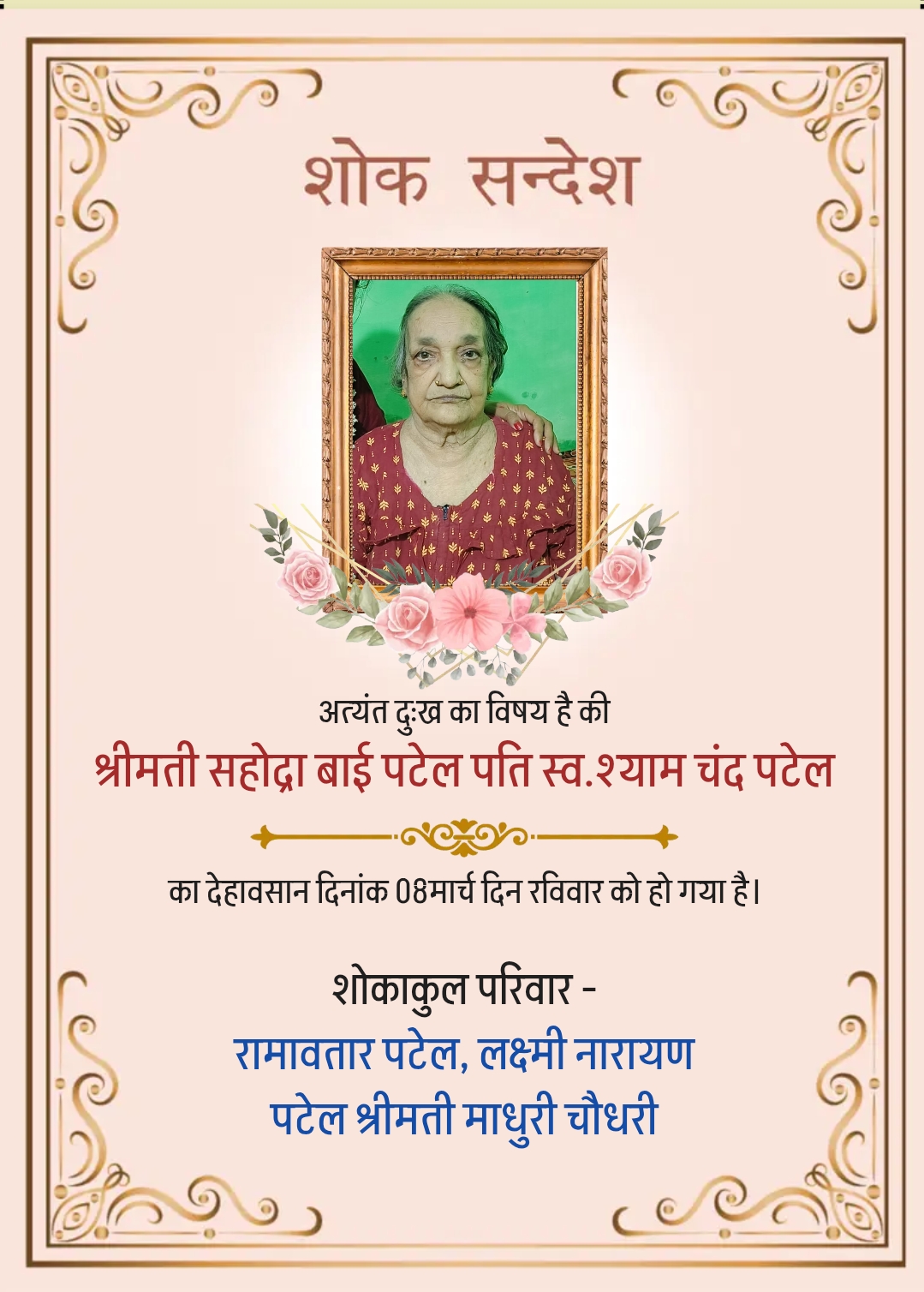 श्रीमती सहोद्रा पटेल को परिवार और समाज में सादगी, पारिवारिक मूल्यों और सामाजिक सौहार्द के लिए याद किया जाता है। उनके शिवलोक गमन को एक पीढ़ीगत अनुभव और पारिवारिक परंपरा के अवसान के रूप में भी देखा जा रहा है।