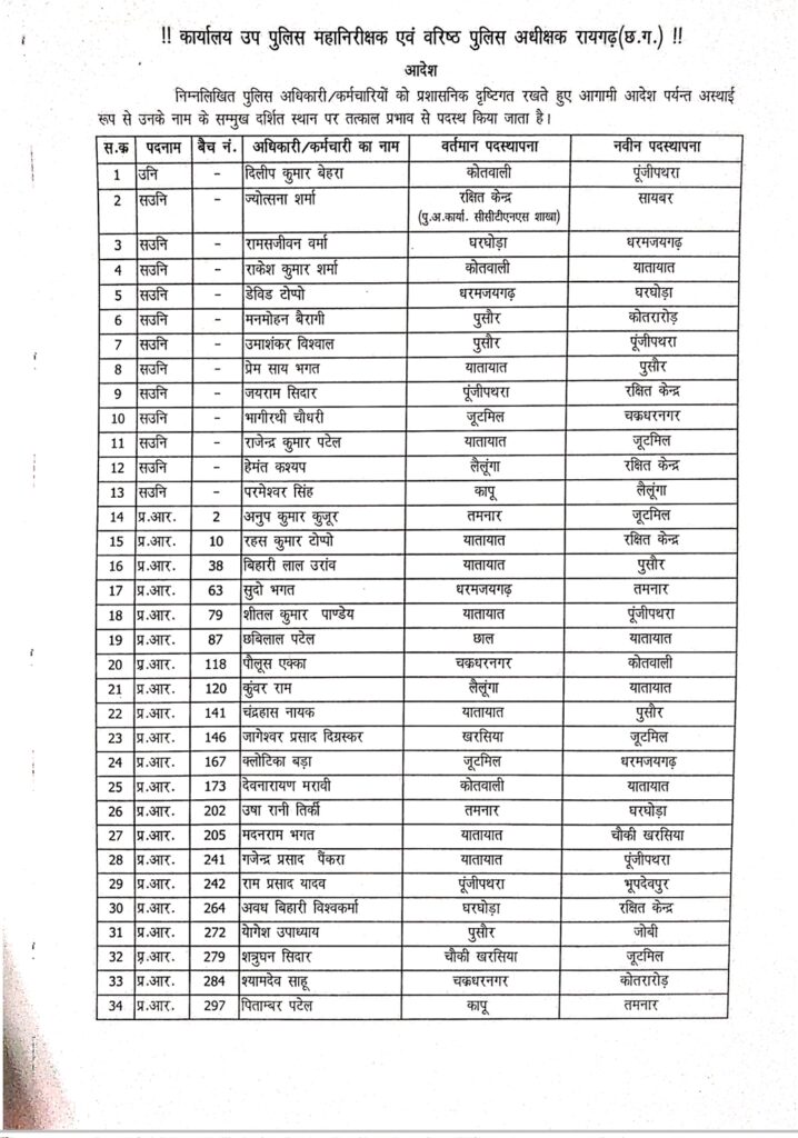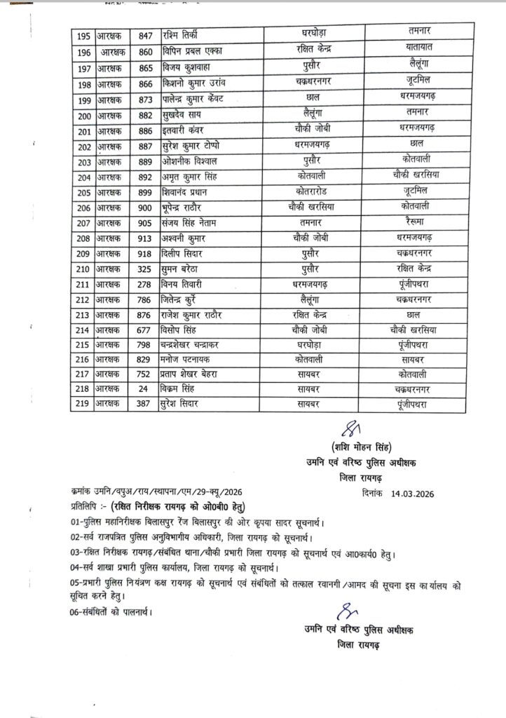 रायगढ़। जिले में पुलिस व्यवस्था को अधिक प्रभावी बनाने के उद्देश्य से वरिष्ठ पुलिस अधीक्षक शशि मोहन सिंह ने पुलिस विभाग में बड़ा प्रशासनिक फेरबदल किया है। शनिवार शाम जारी आदेश में 200 से अधिक पुलिसकर्मियों के तबादले किए गए हैं।
