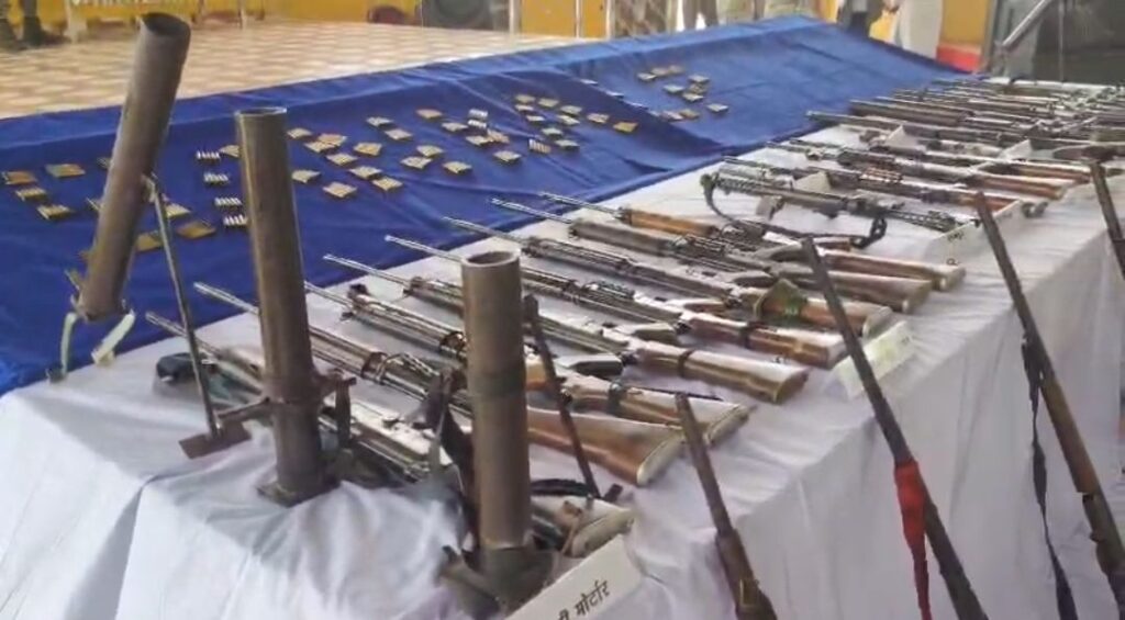 दंतेवाड़ा।छत्तीसगढ़ के दंतेवाड़ा में नक्सल उन्मूलन अभियान के अंतिम चरण में 5 नक्सलियों ने आत्मसमर्पण कर दिया। समर्पण के बाद उनकी निशानदेही पर सुरक्षा बलों ने भारी मात्रा में डंप किए गए हथियार और सामग्री बरामद की है।