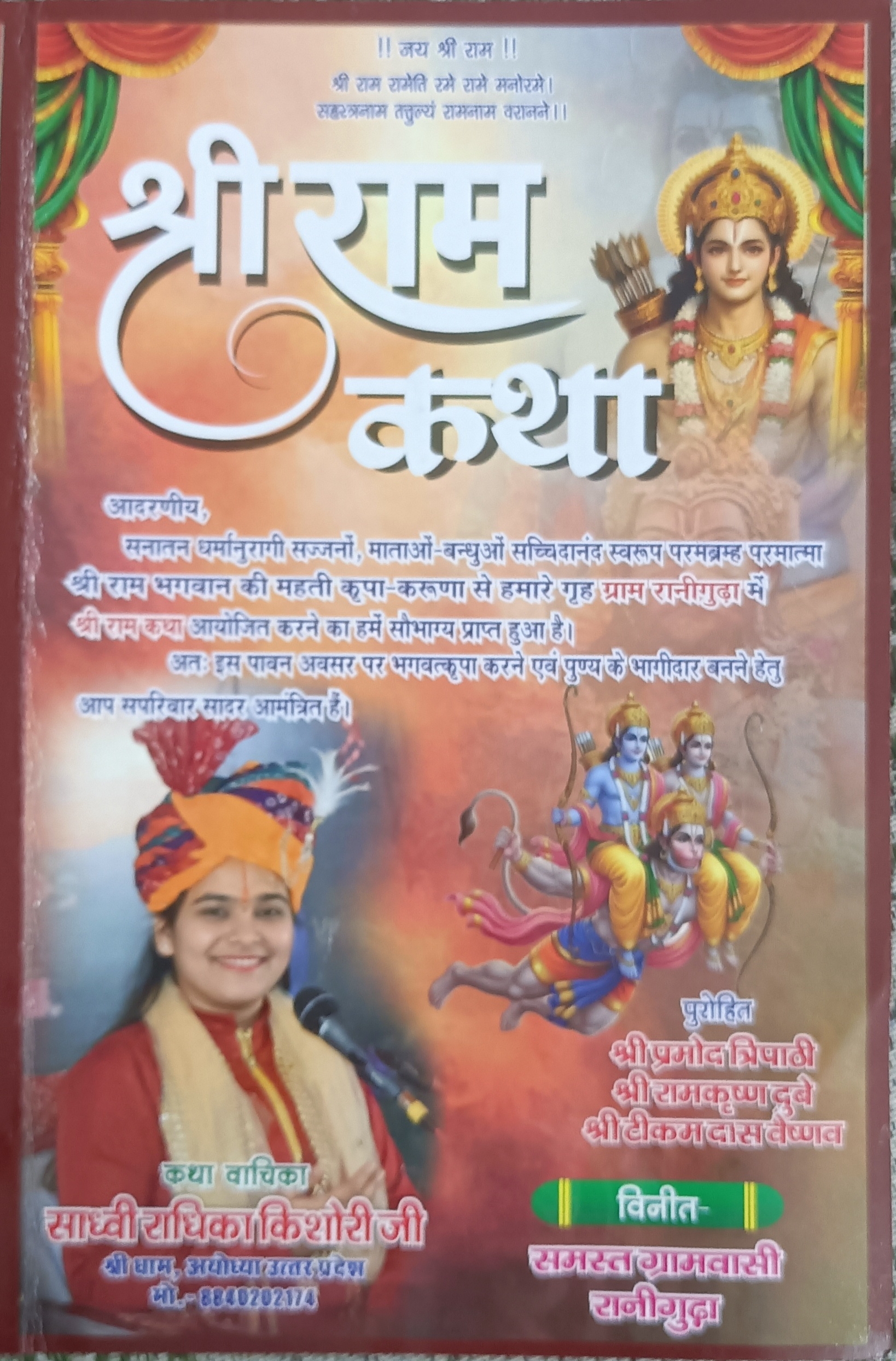 रानीगुढ़ा की यह श्री राम कथा केवल एक धार्मिक कार्यक्रम नहीं, बल्कि समाज को जोड़ने, दिशा देने और प्रेरित करने का एक सशक्त प्रयास है। सियाराम के रसिकजन, श्रद्धालु एवं क्षेत्रवासी इस पावन अवसर पर सहभागिता कर न केवल पुण्य के भागीदार बन सकते हैं, बल्कि एक सुदृढ़ और मूल्यनिष्ठ समाज के निर्माण में अपनी भूमिका भी निभा सकते हैं।