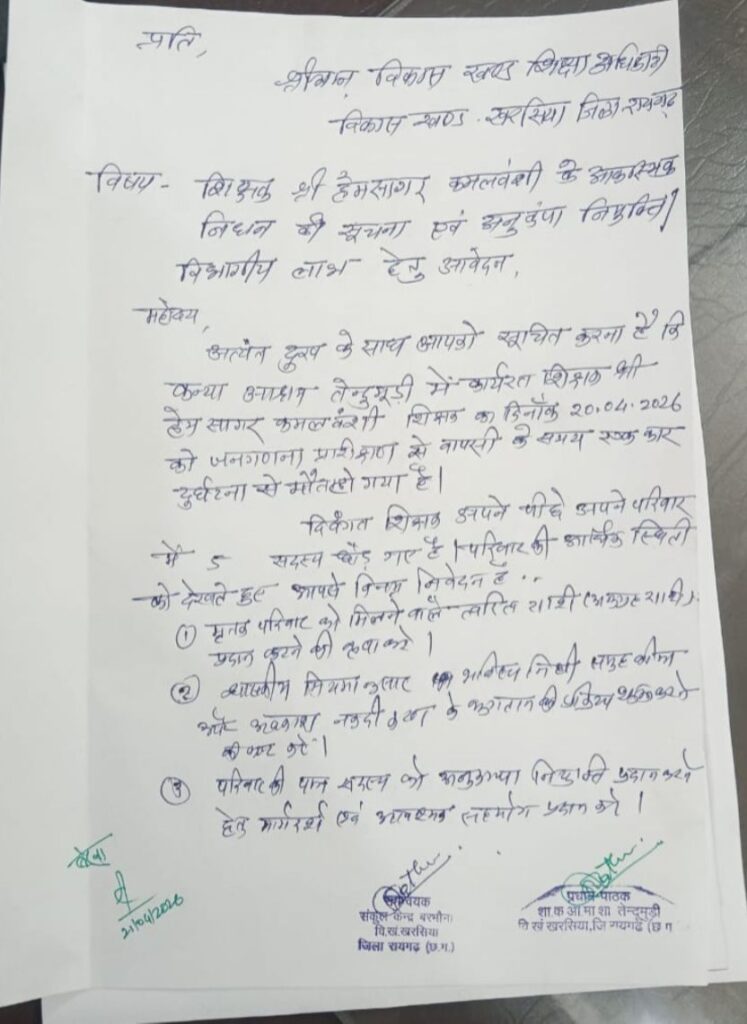 खरसिया।विकासखंड खरसिया के अंतर्गत शासकीय कन्या आश्रम तेन्दुमुड़ी में पदस्थ शिक्षक हेमसागर कमलवंशी की 20 अप्रैल 2026 को एक सड़क दुर्घटना में मृत्यु हो गई। बताया गया कि वे जनगणना प्रशिक्षण से लौट रहे थे, इसी दौरान कार दुर्घटना का शिकार हो गए।