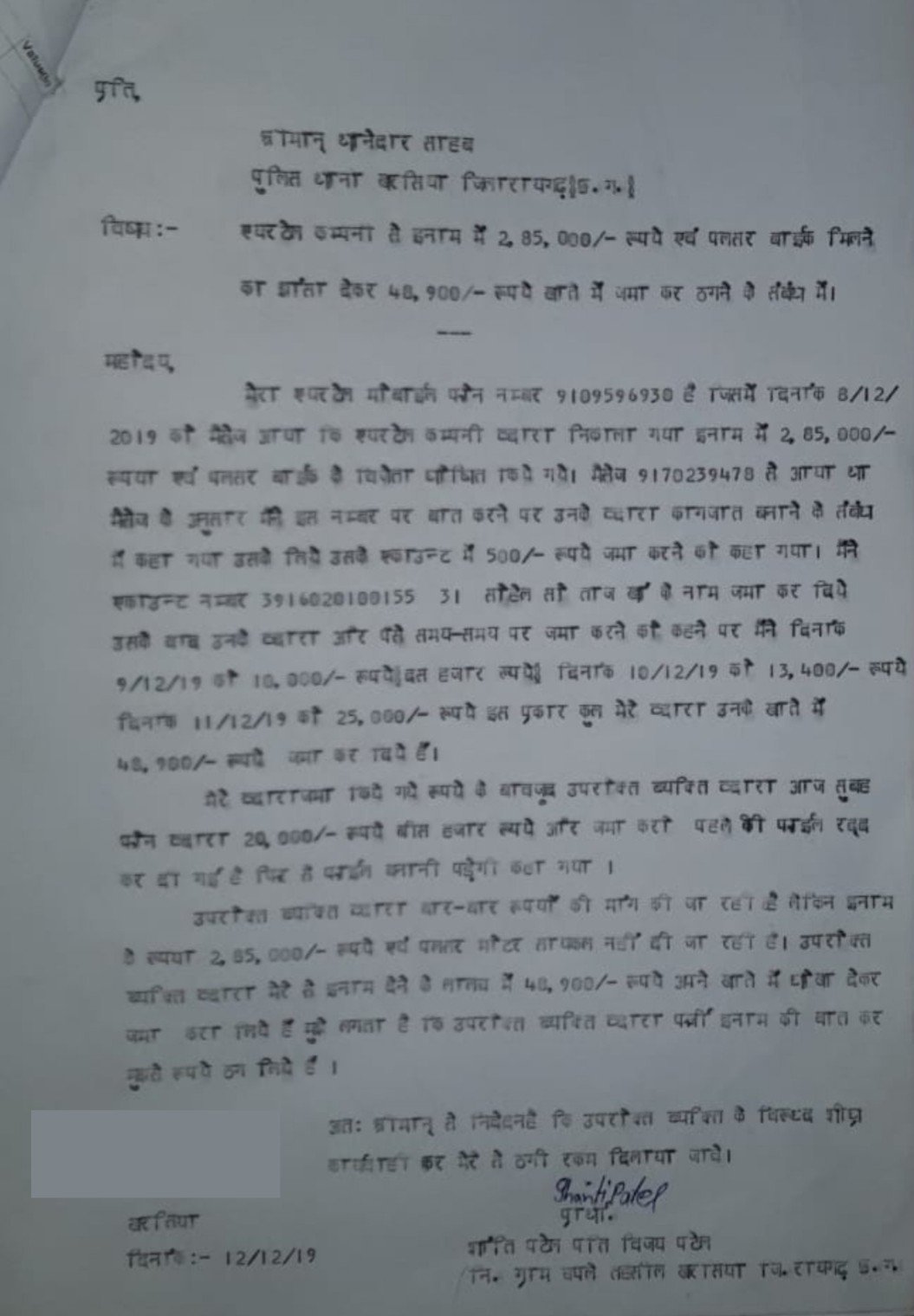 थाना खरसिया क्षेत्र के ग्राम चपले में रहने वाली श्रीमती शांति पटेल पति विजय पटेल उम्र 27 वर्ष ने मोबाईल नम्बर 917023XXXX के धारक द्वारा मोबाईल मैसेज कर 2.85 लाख रूपये एवं पल्सर बाईक जीतने का झांसा देकर अपने खाते में 48,900/- रूपये जमा कराकर धोखाधड़ी करने संबंधी आवेदन पत्र दिया गया है ।