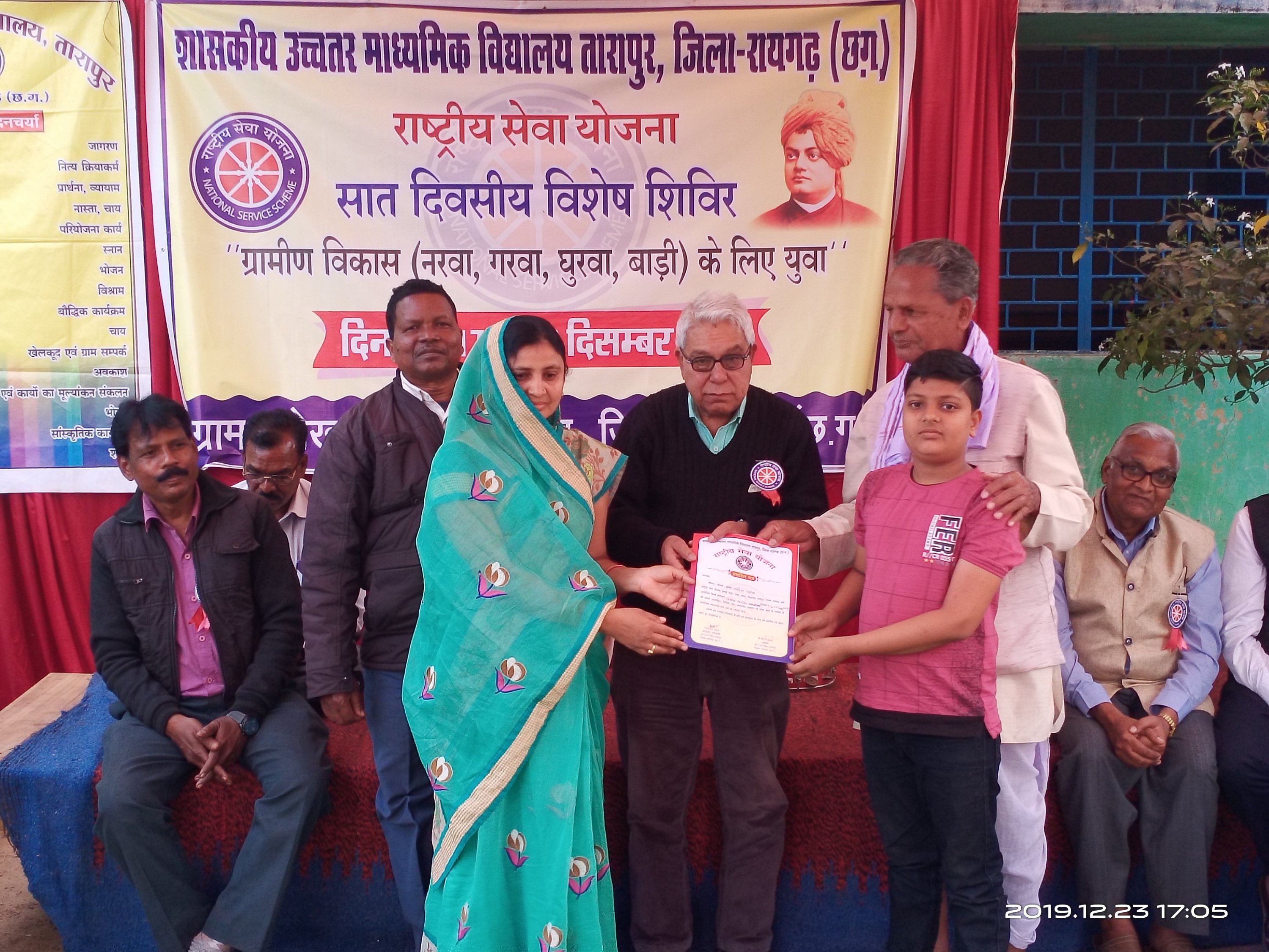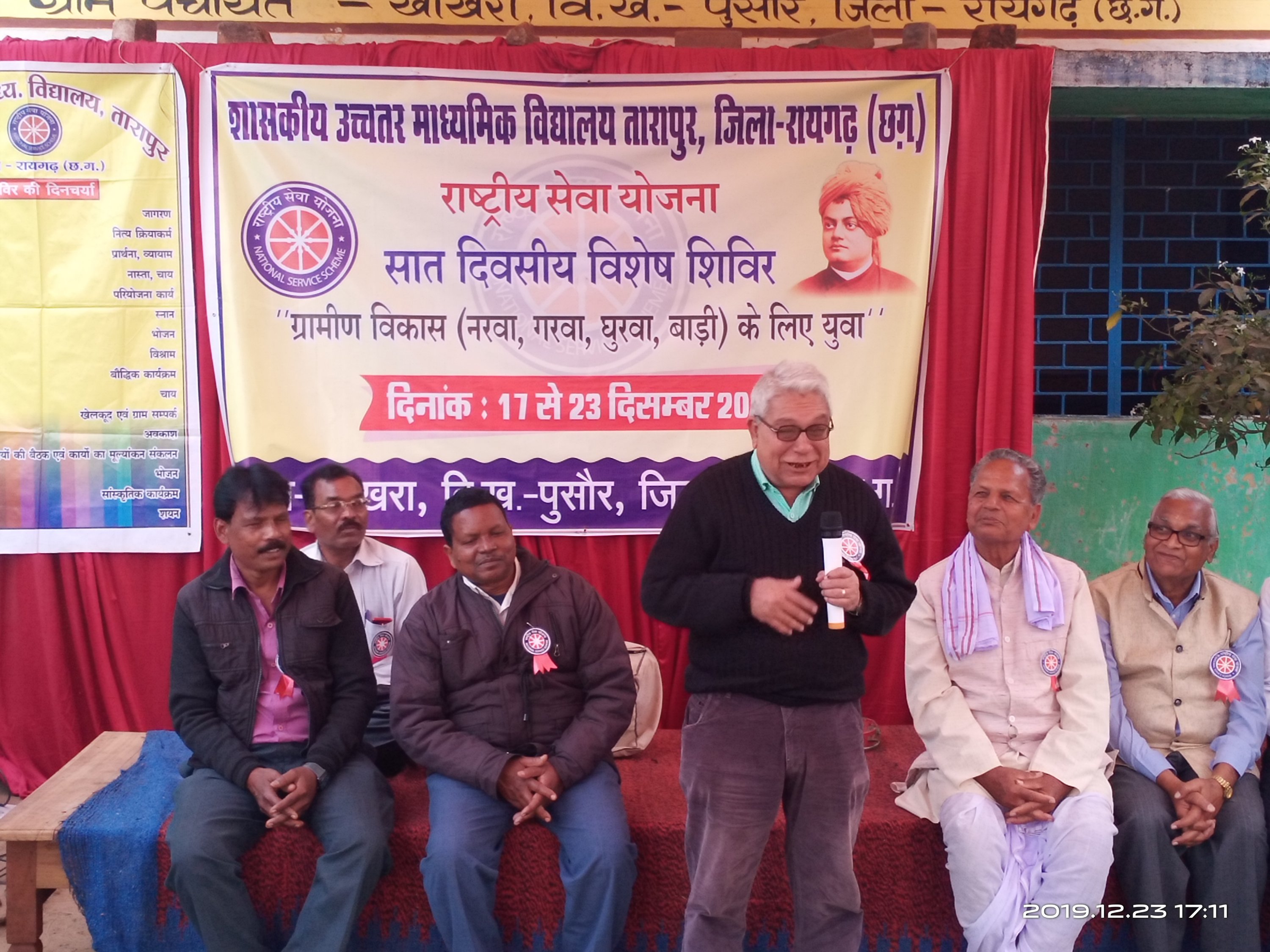 क्योंकि इसके माध्यम से युवा न केवल अपने व्यक्तित्व का विकास करते हैं बल्कि अपने आप को समाज में एक श्रेष्ठ नागरिक के रूप में स्थापित करने में भी सफल होते हैं यह सरकारी योजना होते हुए भी अन्य शासकीय कार्यक्रमों से अलग है जो विद्यार्थी राष्ट्रीय सेवा योजना से जुड़े होते हैं वे सौभाग्यशाली होते हैं। उक्त बातें ग्राम खोखरा में रा.से.यो. तारापुर हायर सेकेण्डरी के सात दिवसीय विशेष शिविर समापन अवसर पर मुख्य अतिथि के रूप में वरिष्ठ पत्रकार एवं सांध्य दैनिक बयार के संपादक सुभाष त्रिपाठी ने अपने उद्बोधन में कहे । कार्यक्रम के दौरान प्राचार्य वी सी पी कालो, प्राचार्य उसरौट भरतसिंह राठिया,स्वास्थ्य विभाग के लालकुमार पटेल नंदेली ने भी अपना प्रेरक उद्बोधन दिया ।सरपंच प्रतिनिधि मकरध्वज पटेल ने अपने भावपूर्ण उद्बोधन में शिविर आयोजन हेतु विशेष रुप से धन्यवाद देते हुए अपनी तरफ से हुई त्रुटियों हेतु क्षमा याचना की। सात दिवसीय विशेष शिविर के समापन अवसर पर पत्रकार प्रकाश थवाईत,उप सरपंच केशव पटेल, सेवानिवृत्त व्याख्याता पुरुषोत्तम पटेल, खोखरा माध्यमिक खंड के प्रधान पाठक विनय मोहन पटेल, शिक्षक राज कमल पटेल ,योगेश पटेल, आकाश सिदार, दिलेश्वर बधेल सहित शिक्षकगण ग्राम के प्रतिष्ठित नागरिक ग्राम के मितानिन महिलाएं एवं प्रतिष्ठित जन भारी संख्या में उपस्थित थे।