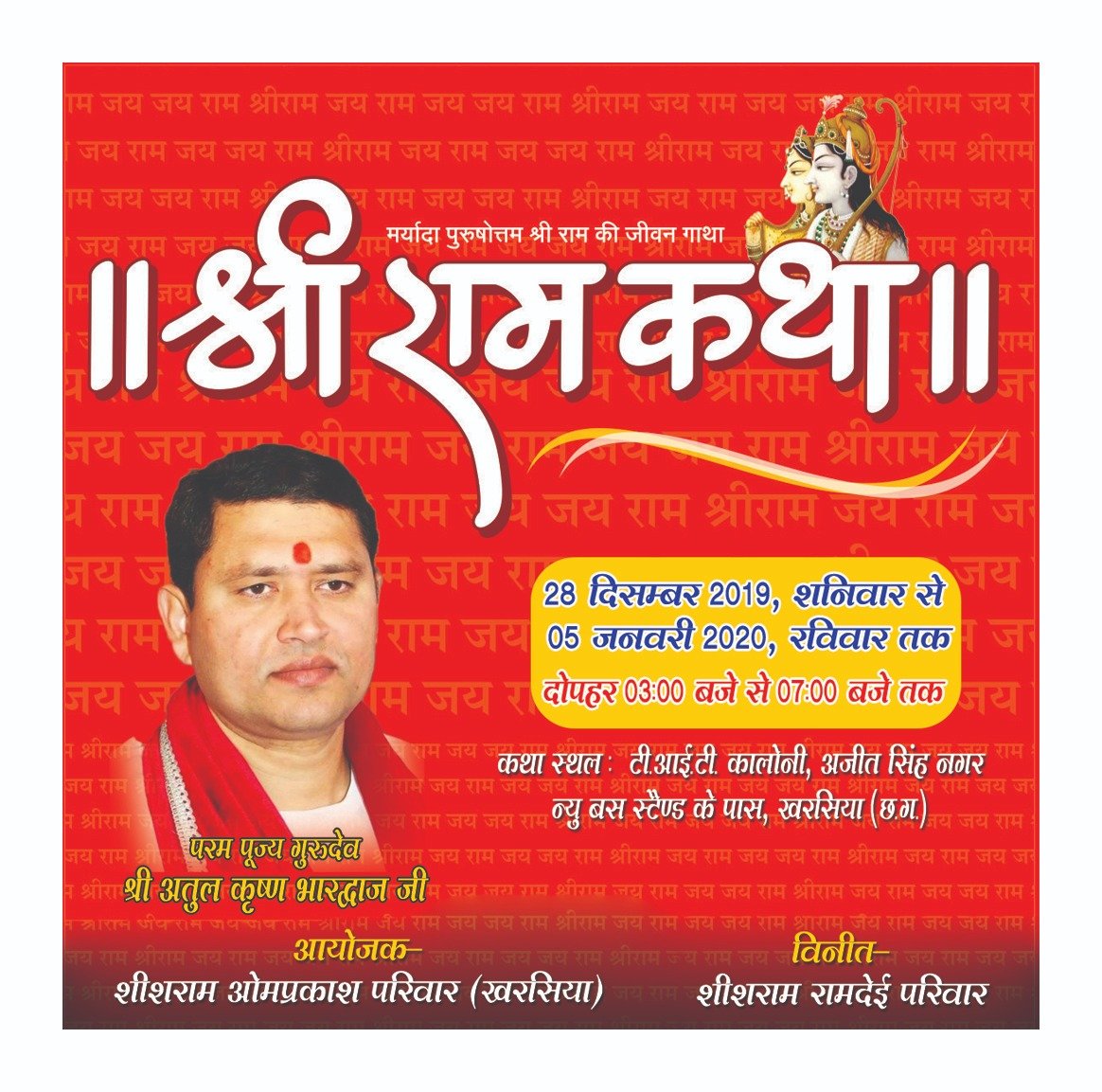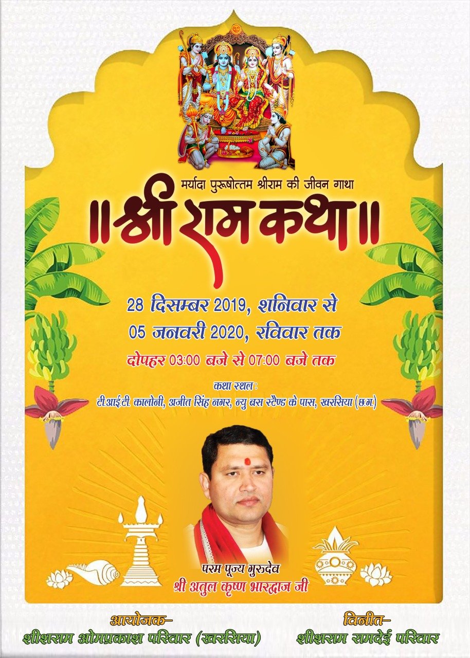 धर्म की नगरी खरसिया में आगामी 28 दिसंबर 2019 शनिवार से 05 जनवरी 2020 रविवार तक भव्य मर्यादा पुरुषोत्तम श्रीराम की जीवन गाथा श्री रामकथा का आयोजन स्थानीय टीआईटी कालोनी अजीत सिंह नगर न्यू बस स्टेण्ड के पास खरसिया में संपन्न होगा। उक्त श्री रामकथा दोपहर 3 बजे से 7 बजे तक प्रख्यात श्रीराम कथावाचक अंतराष्ट्रीय मानस मर्मज्ञ परमपूज्य गुरूदेव आचार्य अतुल कृष्ण भारद्वाज जी के श्रीमुख से संपन्न होगा। कार्यक्रम का शुभारंभ 28 दिसंबर को प्रथम दिवस भव्य कलश एवं शोभा यात्रा मंगलाचरण नाम एवं गुरूमहिमा के साथ प्रारंभ होगा जो दिनांक 05 जनवरी 2020 को नवम दिवस रविवार को रामराजगद्दी प्रसंग के साथ कथा विश्राम किया जावेगा। आयोजक परिवार शीशराम ओमप्रकाष परिवार द्वारा कथा श्रवण हेतु खरसिया नगर के विभिन्न स्थानों से बस की भी व्यवस्था की गई है।