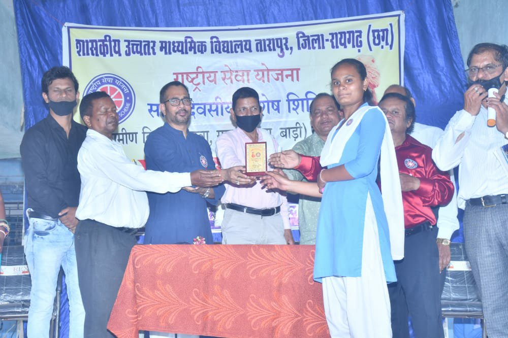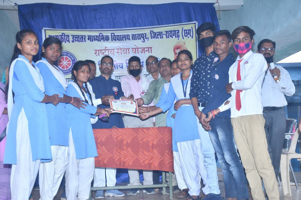 एनएसएस के सात दिवसीय विशेष शिविर का समापन जिला पंचायत अध्यक्ष निराकार पटेल के मुख्य आतिथ्य एवं सरपंच ग्राम पंचायत तारापुर राजू डनसेना की अध्यक्षता, जिला कांग्रेस कमेटी रायगढ़ शहर के पूर्व अध्यक्ष नागेंद्र नेगी जिला पंचायत सदस्य अवधराम पटेल के विशिष्ट आतिथ्य में दिनांक गुरुवार 18 मार्च को संपन्न हुआ। इस अवसर पर सेवानिवृत्त व्याख्याता अंतर्यामी चौधरी, विद्यालय के प्राचार्य विद्याचरण प्रसाद कालो, ग्राम पंचायत के उप सरपंच श्रीमती यशोदा कैलाश निषाद, डोलनारायण पटेल एवं एनएसएस के पूर्व छात्र छत्तीसगढ़ी फिल्मों के हास्य कलाकार तरुण बघेल की विशेष उपस्थिति रही। कोरोना महामारी काल में कोविड-19 के दिशा निर्देश एवं सुरक्षा मानकों का पालन करते हुए विशेष अनुमति से लगााया गया था । इस विशेष शिविर में छात्रों द्वारा किए गए कार्यों की सराहना करते हुए कार्यक्रम के मुख्य अतिथि जिला पंचायत अध्यक्ष निराकार पटेल ने तारापुर विद्यालय के राष्ट्रीय सेवा योजना इकाई की विशेष रुप से प्रशंसा की तथा शिविर में शामिल स्वयं सेवकों को अपनी शुभकामनाएं प्रदान की। वही कार्यक्रम की अध्यक्षता कर रहे ग्राम पंचायत तारापुर के सरपंच राजीव डनसेना ने कहा कि यह हमारे लिए सौभाग्य का विषय है कि तारापुर विद्यालय में राष्ट्रीय सेवा योजना बेहतर रूप से काम कर रही है और हम उनके आयोजन में हर संभव सहयोग देने के लिए तत्पर हैं । विशिष्ट अतिथि नागेंद्र नेगी ने कहा कि इस शिविर में शामिल प्रत्येक विद्यार्थी बहुत कुछ सीख कर जा रहा है और उन्हें इस शिविर में अपने भीतर कुछ न कुछ बदलाव का एहसास जरूर हो रहा होगा। इस अवसर पर अंतर्यामी चौधरी ने एन एस एस शिविर के विशेष थीम नरवा, गरवा, घुरवा, बारी विषय पर केंद्रित अपना वक्तव्य दिया । इसी कड़ी में जिला पंचायत सदस्य अवधराम पटेल ने राष्ट्रीय सेवा योजना के कार्यों को समुद्र मंथन की तरह बताते हुए इसके माध्यम से ज्ञान रुपी अमृत तत्व के उपलब्धि होने की बात कही जिसमें विद्यार्थी चर्चा परिचर्चा के माध्यम से सेवा कार्यों के द्वारा अपने भीतर क्षमता का विकास करते हैं। डोलनारायण पटेल ने भी राष्ट्रीय सेवा योजना शिविर के कार्यों की सराहना की एवं महिला स्व सहायता समूह के रायगढ़ ब्लाक अध्यक्ष श्रीमती कमला पटेल ने अपने समूह के उपलब्धियों की जानकारी दी तथा राष्ट्रीय सेवा योजना स्वयंसेवकों द्वारा किए गए कार्यों की सराहना की।