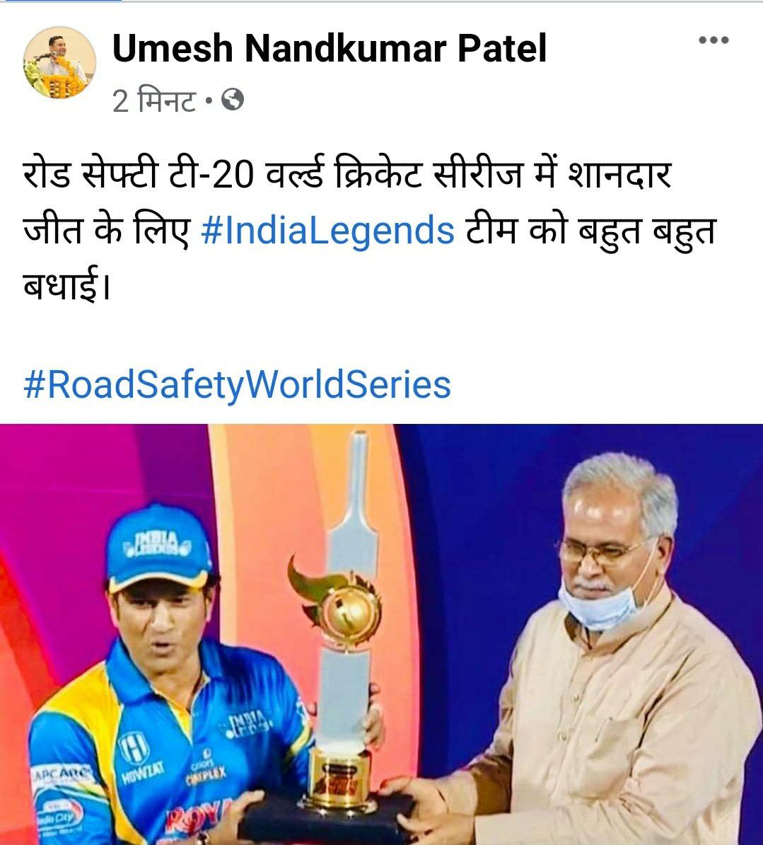 मुख्यमंत्री भूपेश बघेल ने विजेता इंडिया लीजेंड्स टीम को प्रदान की ट्राफी