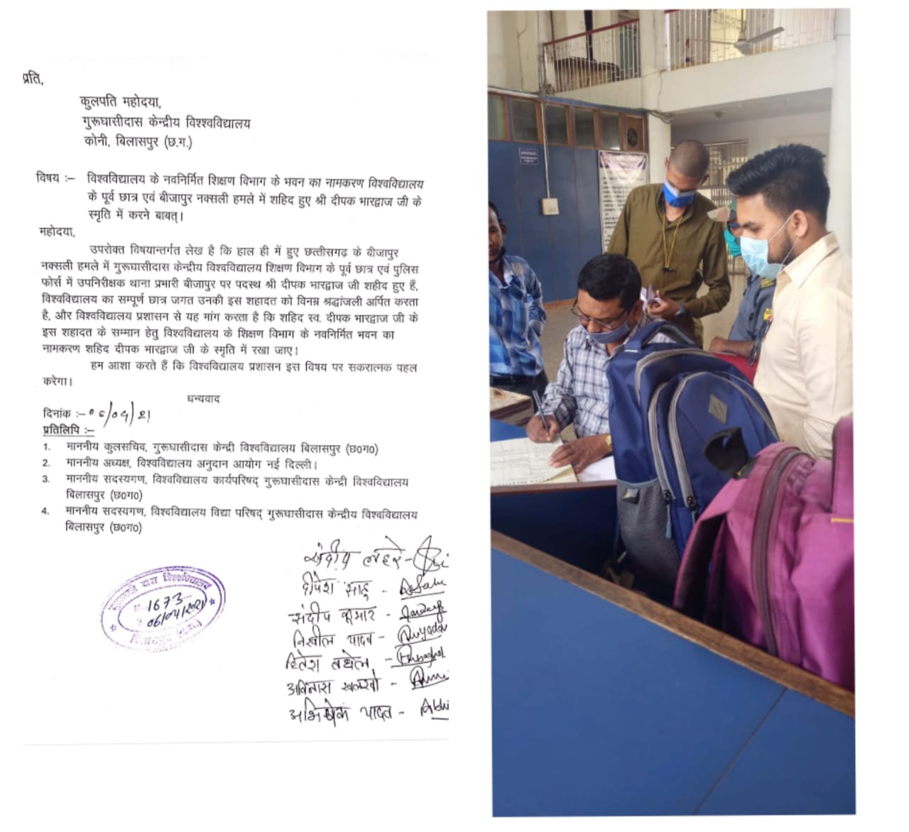 जीजीयू बिलासपुर के पूर्व छात्र है शहीद दीपक भारद्वाज ज्ञापन दते समय उपस्तिथ रहे छात्र प्रतिनिधि संदीप लहरे , दीपेश साहू (उपाध्यक्ष), संदीप कुमार, आकाश खन्ना , अविनाश खलखो , अभिषेक यादव , रौशन बंजारे , यूराज लहरे , नवजोत लहरे , प्रशांत ,दीपक जैसवाल , श्रीकांत भारद्वाज , आदि उपस्थित थे । विश्वविद्यालय प्रशासन ने आश्वासन दिया है उनके नाम से रखा जाए भवन ।