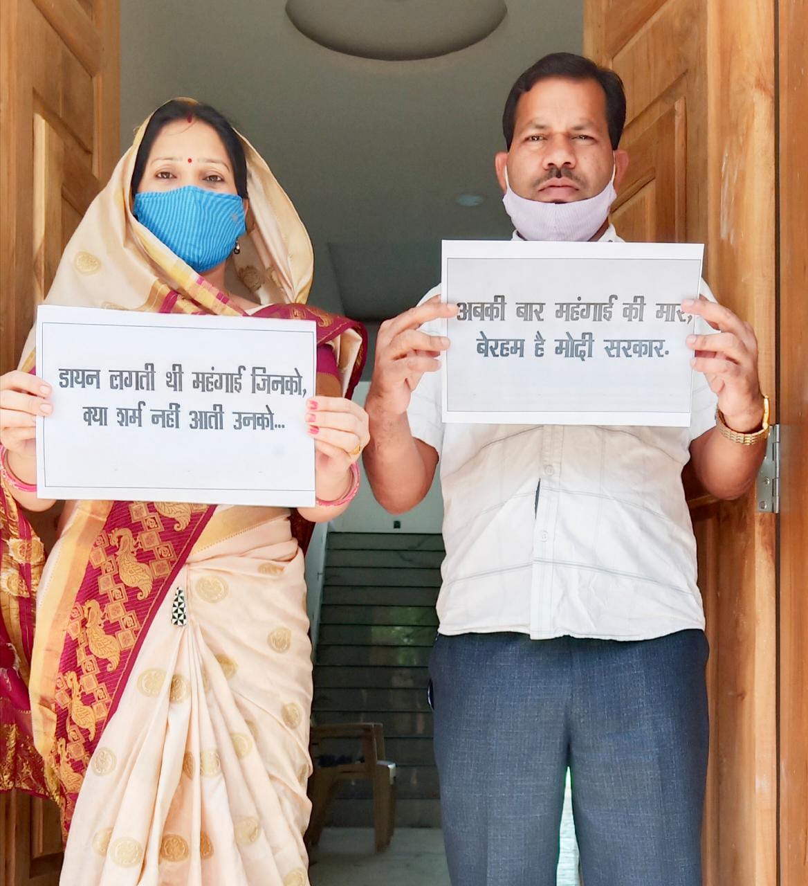 सारंगढ। प्रदेश कांग्रेस कमेटी के आव्हान पर आज छत्तीसगढ़ अजा विकास प्राधिकरण उपाध्यक्ष विधायक श्रीमती उत्तरी जांगड़े ने अपने पति जनपद उपाध्यक्ष गनपत जांगड़े के साथ तथा जिलाध्यक्ष ग्रामीण अरूण मालाकार सुरज तिवारी रविन्द्र नन्दे बिनोद भारद्वाज पालू मिश्रा मितेन्द्र यादव गोपाल केडिया इत्यादि अपनें अपने घरों के सामने बैठ कर वर्चुअल धरना प्रदर्शन किया और कहा कि केंद्र में बैठी मोदी सरकार मंहगाई रोकने में विफल है और आज महगाई डायन हो चुकी है पेट्रोल, डीजल,रसोई गैस के दाम आसमान छू रहे है।