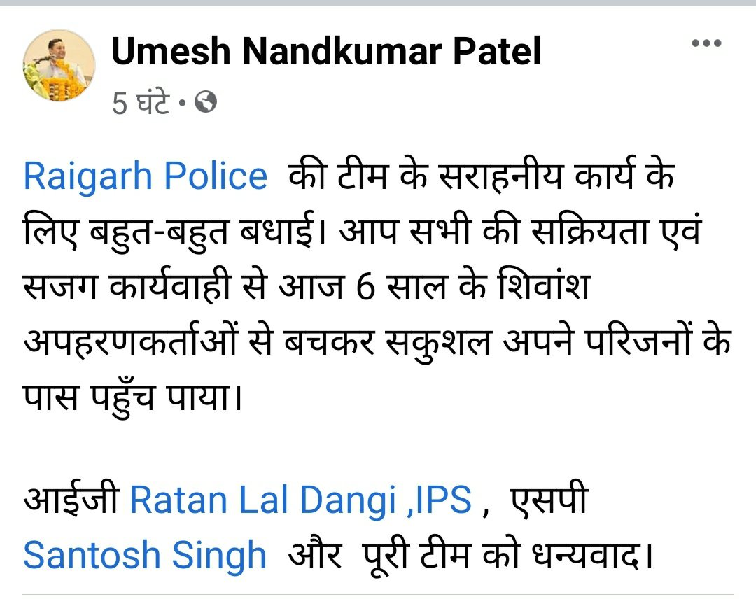 सफलता के बाद बधाइयों का दौर जारी है। सीएम और गृहमंत्री के साथ कैबिनेट मंत्री एवं खरसिया विधायक उमेश पटेल ऑपरेशन के दौरान बच्चे की वापसी के लिए चिंतित थे उन्होंने सफलता के लिए खरसिया पुलिस को बधाई दी है।
