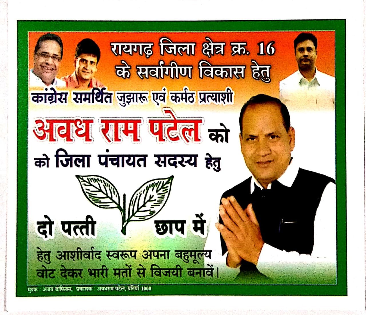 इसी कड़ी में जिला पंचायत सदस्य के लिए क्षेत्र क्रमांक 16 खरसिया 3 से कांग्रेस प्रत्याशी अवधराम पटेल के द्वारा