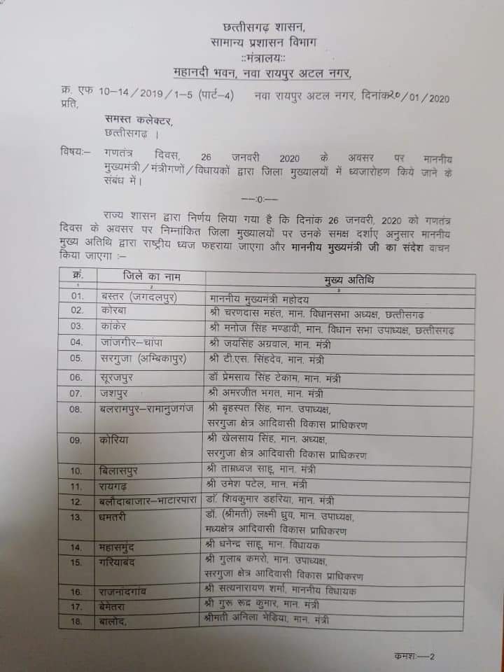 सरगुजा क्षेत्र आदिवासी विकास प्राधिकरण के अध्यक्ष खेलसाय सिंह कोरिया में और उपाध्यक्ष वृहस्पत सिंह बलरामपुर-रामानुजगंज में, उपाध्यक्ष गुलाब कमरो गरियाबंद जिले में ध्वजारोहरण करेंगे। मध्यक्षेत्र आदिवासी विकास प्राधिकरण के अध्यक्ष लालजीत सिंह राठिया मुंगेली में एवं उपाध्यक्ष डॉ. श्रीमती लक्ष्मी धु्रव धमतरी में, बस्तर क्षेत्र आदिवासी विकास प्राधिकरण के अध्यक्ष लखेश्वर बघेल बीजापुर में और उपाध्यक्ष संतराम नेताम दंतेवाड़ा में ध्वजारोहण करेंगे। सांसद दीपक बैज नारायणपुर में, विधायक धनेन्द्र साहू महासमुंद में, सत्यनारायण शर्मा राजनांदगांव में और मोहनलाल मरकाम कोण्डागांव जिला मुख्यालय में आयोजित गणतंत्र दिवस के मुख्य समारोह में ध्वजारोहण कर परेड की सलामी लेंगे।