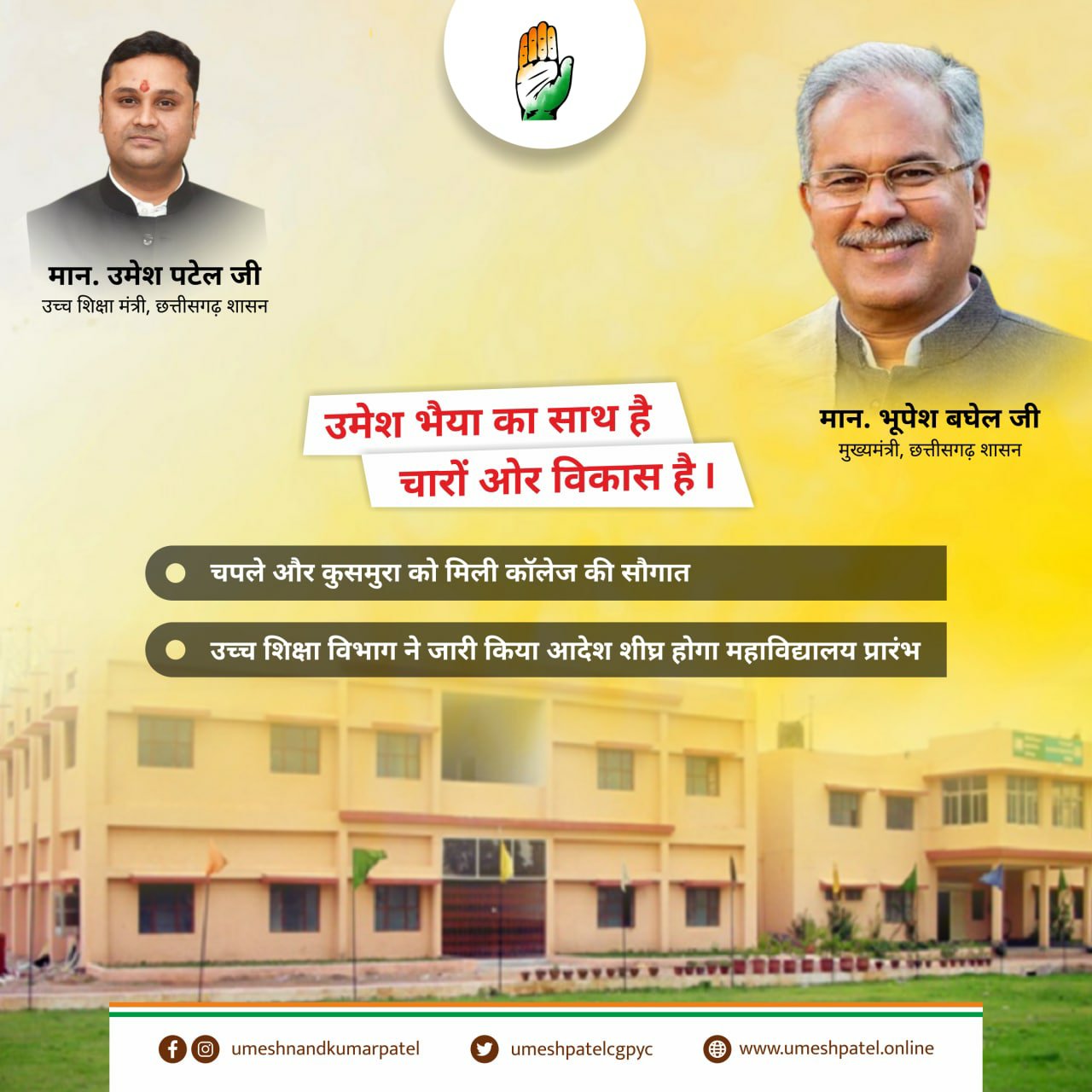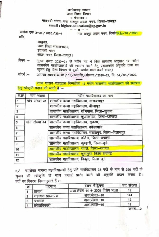उच्च शिक्षा मंत्री उमेश पटेल की विशेष पहल से चपले और कुसमुरा को मिली काॅलेज की सौगात…