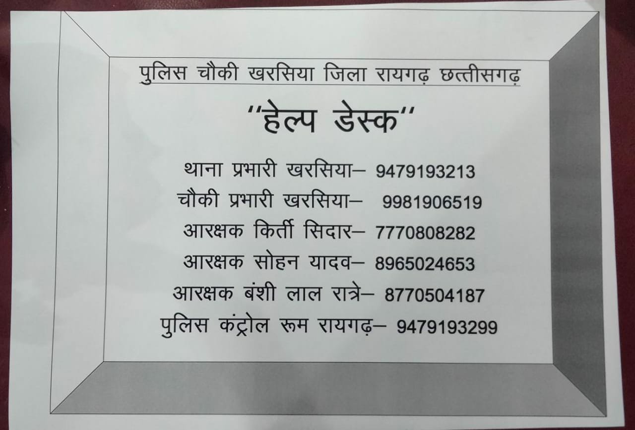 खरसिया पुलिस नगरवासी से आग्रह कर रहा हेल्प डेस्क का नम्बर जरुर अपने सेल और प्रतिष्ठा पर रखे विषमपरिस्थियों पर ढूंढा न पड़े