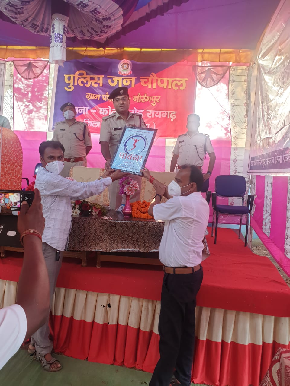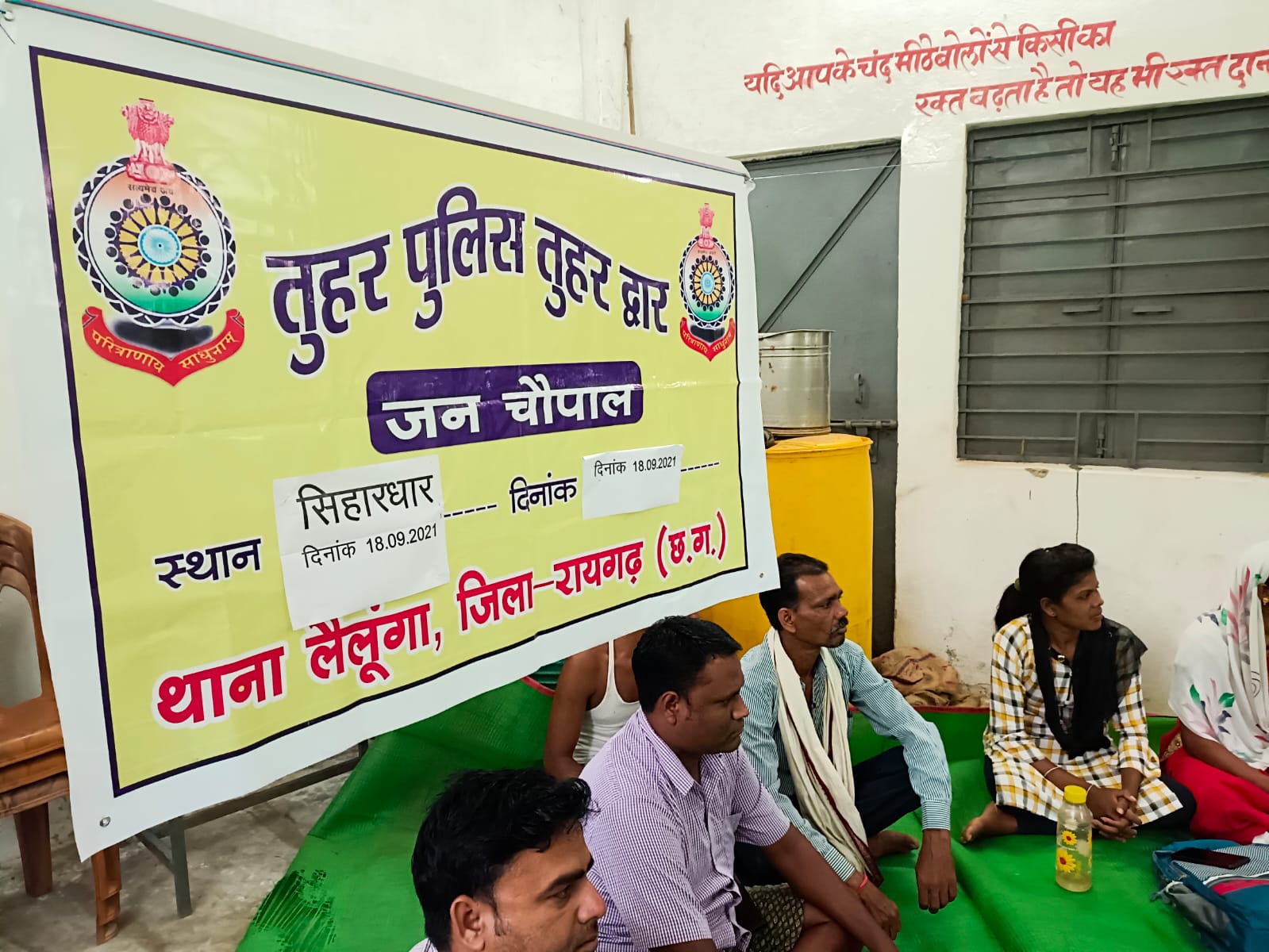 रायगढ़ पुलिस का पुलिस जन चौपाल लगातार सुदूर एवं ग्रामीण अंचलों में आयोजित किया जा रहा है , इसी क्रम में थाना लैलूंगा क्षेत्र अंतर्गत दूरस्थ ग्राम सिधारपारा में पुलिस जन चौपाल की तर्ज पर तूहर पुलिस तूहर द्वार आयोजित किया गया जिसमें थाना प्रभारी लैलूंगा निरीक्षक रूप नारायण साय द्वारा ग्रामीणों को अपराधियों के प्रति जागरूक किया गया ।