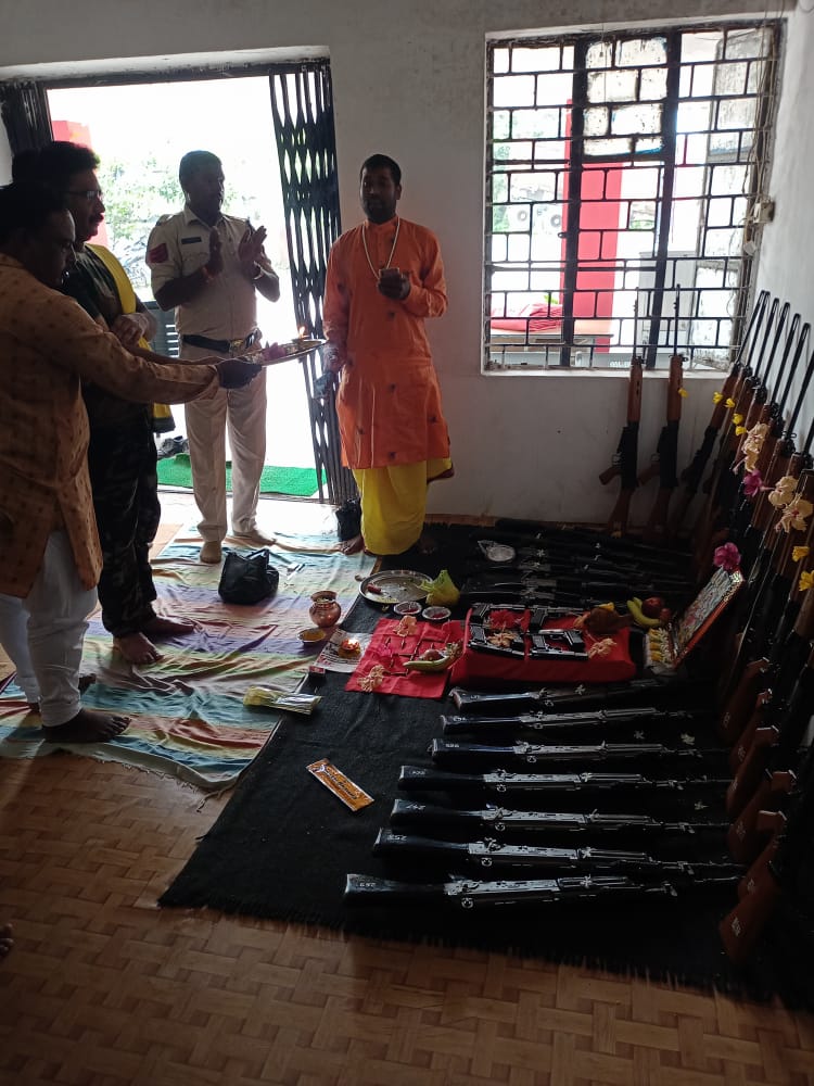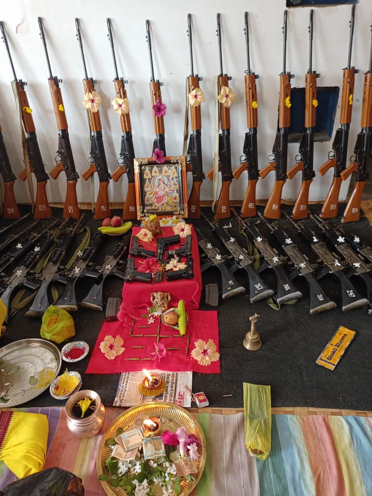 इसी प्रकार सभी थाना, चौकियों में उपलब्ध है आर्म्स एम्युनेशन की पूजा की गई। शस्त्र पूजन में विशेष तौर पर रक्षित केंद्र तथा थाना, चौकियों में उपलब्ध आर्म्स, एम्युनेशन तथा शस्त्र स्वरूप वाहनों की साफ-सफाई आयल, ग्रीसिंग कर पूजन किया जाता है, ऐसे में एक तरीके से शस्त्रों व वाहनों की साफ सफाई भी होती है ।