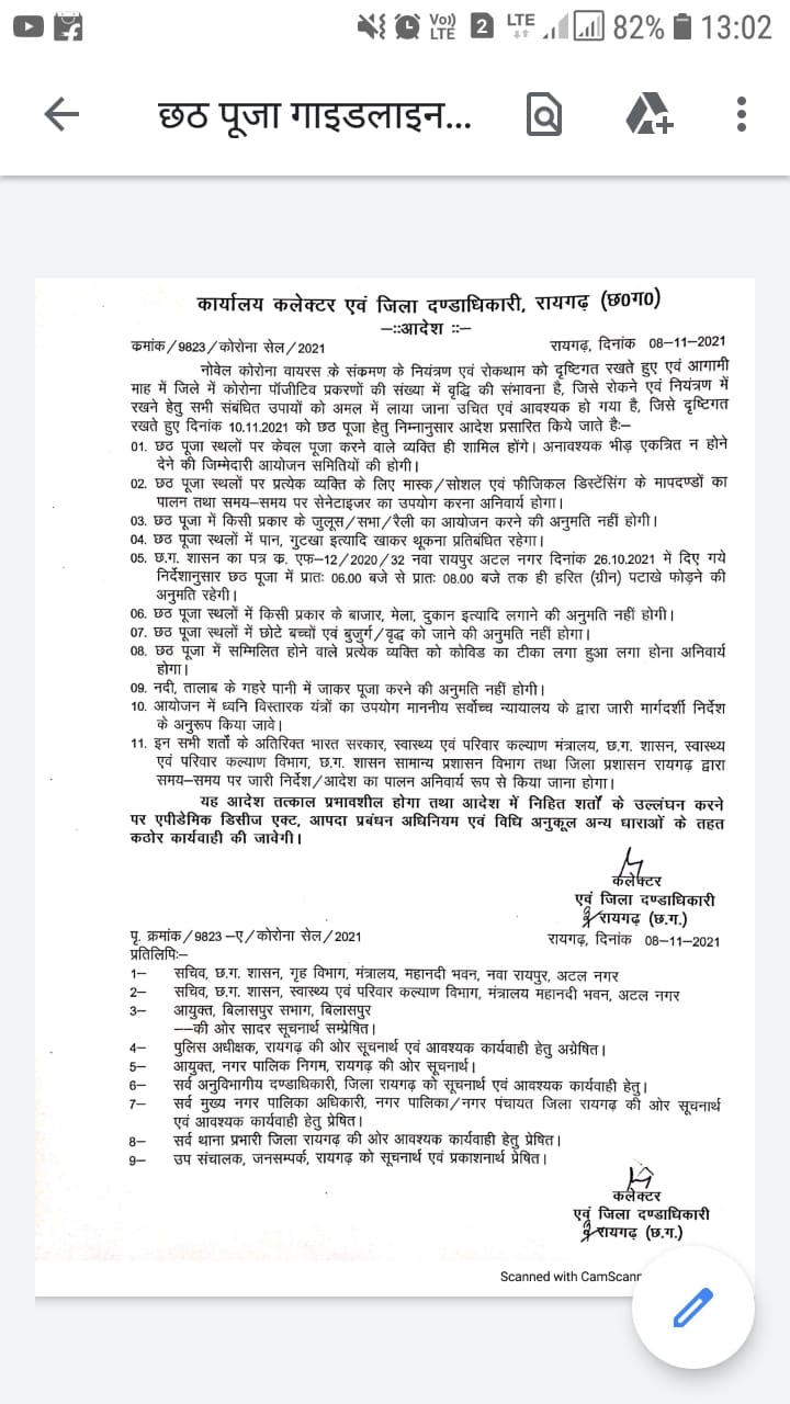 नोवेल कोरोना वायरस के संक्रमण के नियंत्रण एवं रोकथाम को दृष्टिगत रखते हुए एवं आगामी माह में जिले में कोरोना पॉजीटिव प्रकरणों की संख्या में वृद्धि की संभावना है, जिसे रोकने एवं नियंत्रण में रखने हेतु सभी संबंधित उपायों को अमल में लाया जाना उचित एवं आवश्यक हो गया है, जिसे दृष्टिगत रखते हुए दिनांक 10.11.2021 को छठ पूजा हेतु निम्नानुसार आदेश प्रसारित किये जाते है: