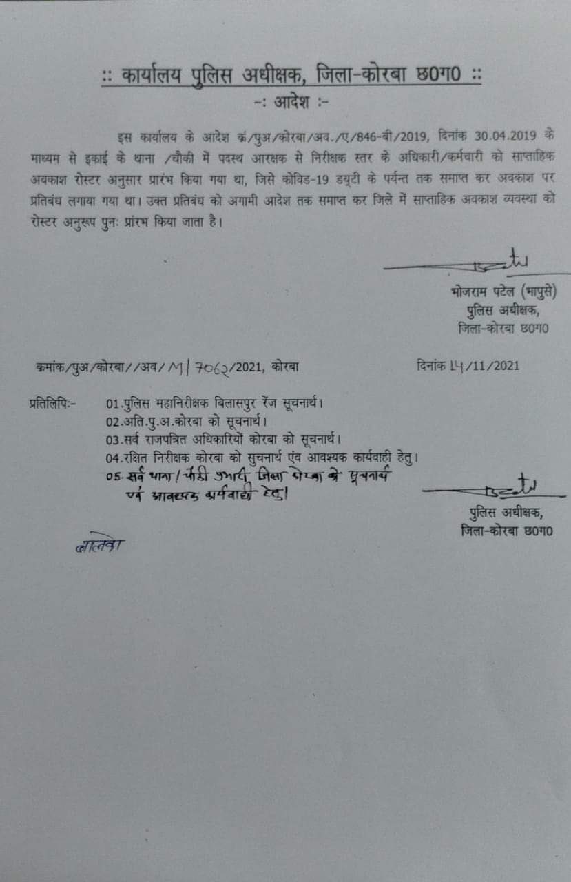 कोरबा जिले में पुलिसकर्मियों के लिए साप्ताहिक अवकाश का आदेश जारी