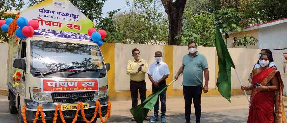 इस मौके पर सीईओ जिला पंचायत सुश्री ऋचा प्रकाश चौधरी भी मौजूद रही। पोषण अभियान अंतर्गत 16 से 31 मार्च तक पोषण पखवाड़ा का आयोजन किया जा रहा है। जिसके तहत यह पोषण रथ पूरे जिले के विभिन्न स्थानों का भ्रमण कर पोषण पर जागरूकता प्रसार के साथ विभिन्न गतिविधियों का संचालन करेगा। उल्लेखनीय है कि पोषण पखवाड़ा 2021 के अंतर्गत विभिन्न उद्देश्य निर्धारित किये गये है जिसके आधार पर गतिविधियां संचालित की जायेगी। जिसके अंतर्गत पोषण वाटिका निर्माण को बढ़ावा दिये जाने हेतु प्रत्येक आंगनबाड़ी केन्द्रों में औषधि/फलदार पौधों का रोपण किया जायेगा।