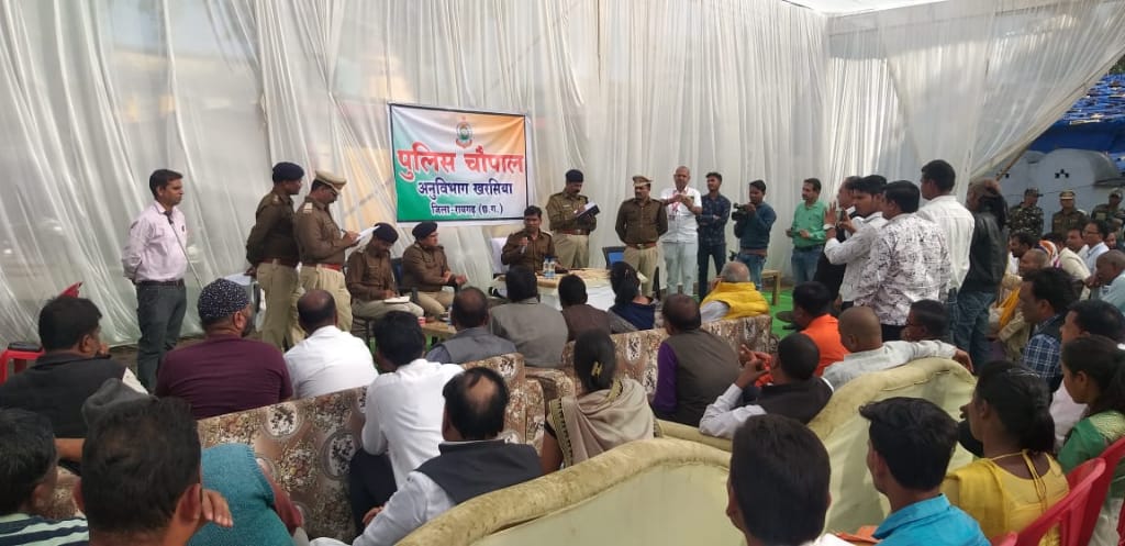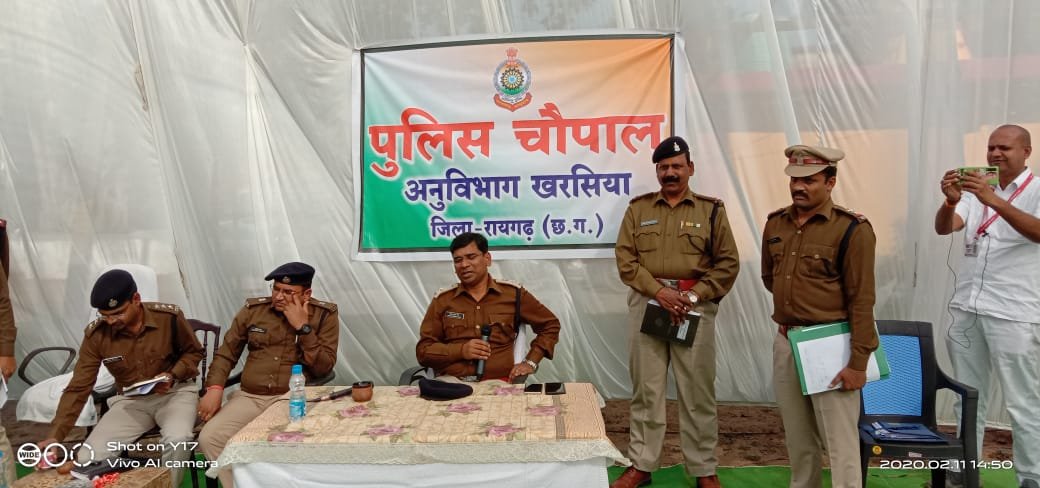 आज दोपहर पुलिस चौकी खरसिया के पीछे खुले मैदान में पुलिस चौपाल लगाई गई जिसमें पुलिस अधीक्षक एवं एडिशनल एसपी वर्मा द्वारा उपस्थित लोगों को सुरक्षा की दृष्टि से अपने प्रतिष्ठानों एवं घर के बाहर सीसीटीवी कैमरे लगाने तथा यातायात नियमों का पालन करने के लिए प्रेरित किए । उपस्थित जन सामान्य को एस.पी. द्वारा साइबर क्राइम के संबंध में विस्तृत जानकारी देकर फ्राड एवं फैक काल से बचने को कहा गया ।