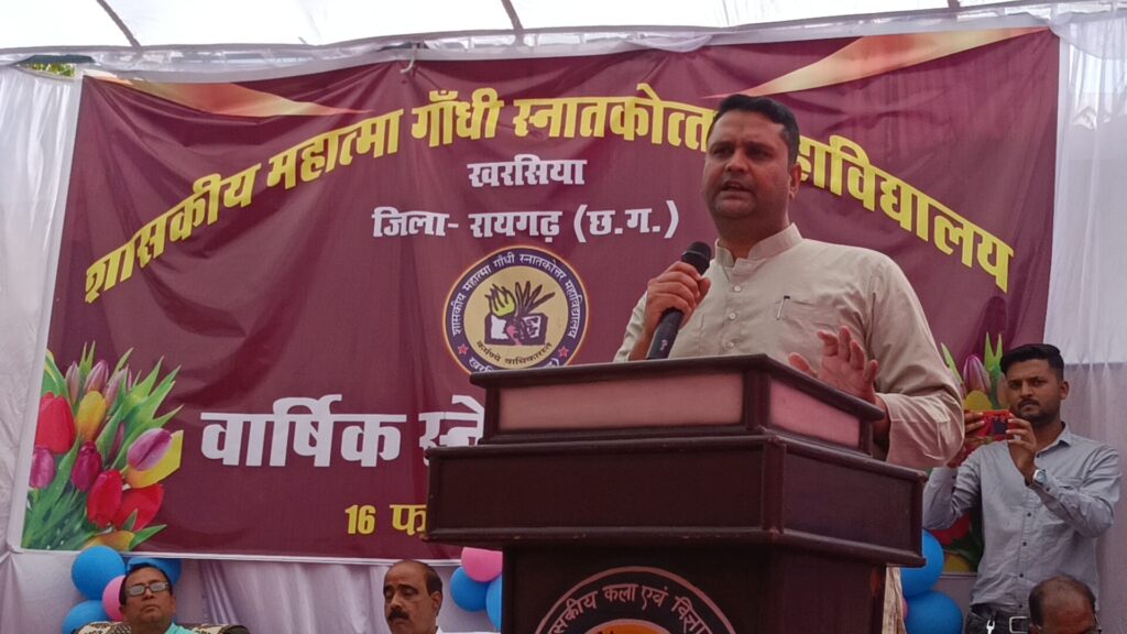 खरसिया शा. महात्मा गाँधी महाविद्यालय वार्षिक स्नेह सम्मेलन में पहुँचे खरसिया विधायक प्रदेश के उच्च शिक्षा, कौशल विकास, तकनीकी शिक्षा एवं रोजगार, विज्ञान एवं प्रौद्योगिकी, खेल एवं युवा कल्याण मंत्री उमेश नंदकुमार पटेल