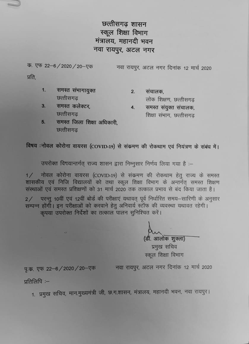 राज्य शासन द्वारा नोवल कोरोना वायरस (COVID-19) से संक्रमण की रोकथाम के लिए प्रदेश के समस्त शासकीय तथा निजी विद्यालयों को और स्कूल शिक्षा विभाग के अंतर्गत समस्त शिक्षण संस्थाओं तथा समस्त प्रशिक्षण संस्थानों को 31 मार्च 2020 तक तत्काल प्रभाव से बंद रखने का निर्देश दिया गया है। इस आशय का आदेश आज मंत्रालय महानदी भवन स्थित स्कूल शिक्षा विभाग द्वारा प्रदेश के समस्त संभागायुक्त, संचालक लोक शिक्षण, कलेक्टर, संयुक्त संचालक शिक्षा विभाग और जिला शिक्षा अधिकारियों को जारी कर दिया गया है। इसमें 10वीं तथा 12वीं बोर्ड की परीक्षाएं यथावत पूर्व निर्धारित समय-सारिणी के अनुसार सम्पन्न होगी। इन परीक्षाओं के संचालन के लिए आवश्यक स्टाफ की व्यवस्था यथावत रहेगी।